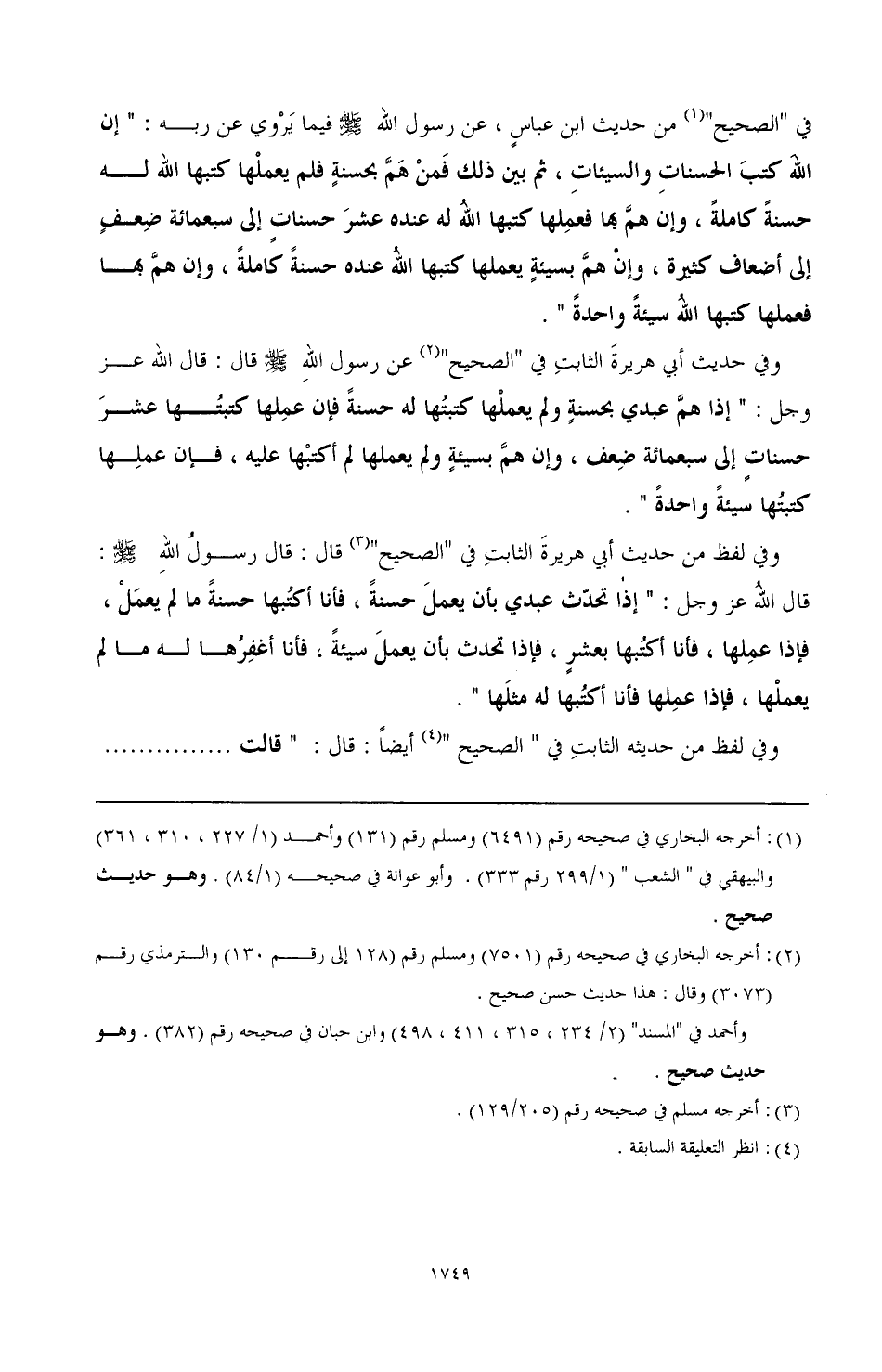 (¬3) قال الحافظ في "الفتح" (11/ 325): قال المازري: ذهب ابن الباقلاني يعني ومن تبعه إلى أن من عزم على المعصية بقلبه ووطن عليها نفسه أنه يأثم، وحمل الأحاديث الواردة في العفو عمن هم بسيئة ولم يعملها على الخاطر الذي يمر بالقلب ولا يستقر. قال المازري: وخالفه كثير من الفقهاء والمحدثين والمتكلمين، ونقل ذلك نص الشافعي. ويؤيده قوله في حديث أبي هريرة فيما أخرجه مسلم من طريق همام عنه بلفظ "فأنا أغفرها له ما لم يعملها".