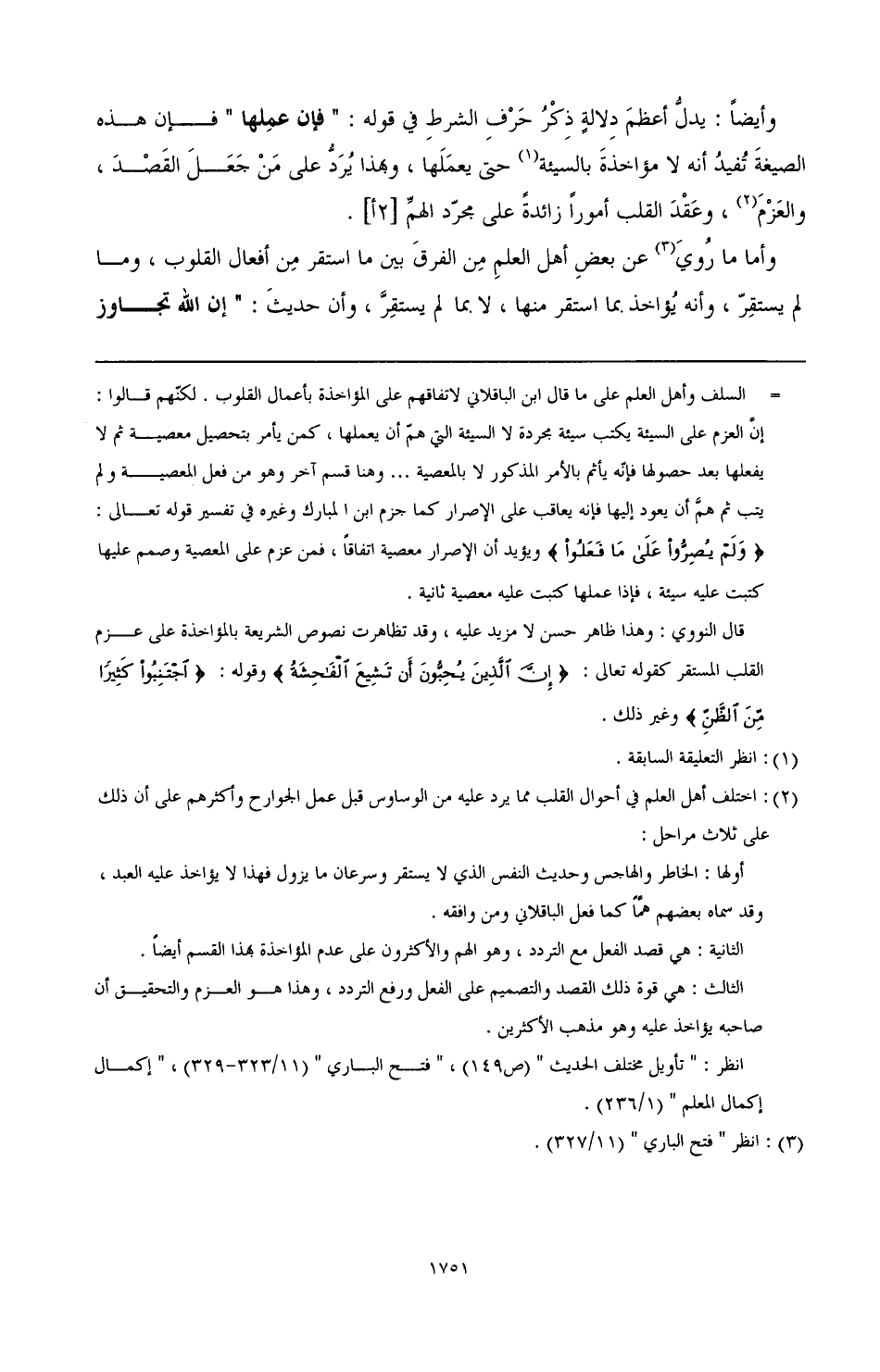 وقد استدل بعض القائلين بالتفرقة المذكورة بقوله سبحانه: {فأقم وجهك للدين حنيفا فطرت الله التي فطر الناس عليها} (¬2) وجعل هذه الآية دليلًا على تأويل حديث التجاوز عن حديث النفس، وتخصيصه بما لم يستقر في الحديث! ولا يخفاك أنه لا دلالة في الآية على ما استدل به لا بمطابقة، ولا تضمن، ولا التزام! وبيان ذلك: أن قوله: {فأقم وجهك للدين} (¬3) إن أريد به معناه الحقيقي، فليس فيه الأمر بمجرد الإقامة للوجه، وذلك عمل جارحة لا عمل قلب، وإن كان المراد بإقامة الوجه: الكناية عن الإتيان بأمور الدين التي شرعها الله لعباده، فهي: أقوال وأفعال، لا حديث نفس! وإن كان محل الاستدلال الذي زعمه هذا المستدل هو قوله في الآية: {فطرت الله التي فطر الناس عليها} (¬4): فليس في ذلك إلا أن كل مولود يولد على الفطرة، وهذه الفطرة (¬5) هي الخلقة التي خلقها الله عليها، والطبع الذي طبعه عليه، وليست من حديث النفس في ورد ولا صدر!.