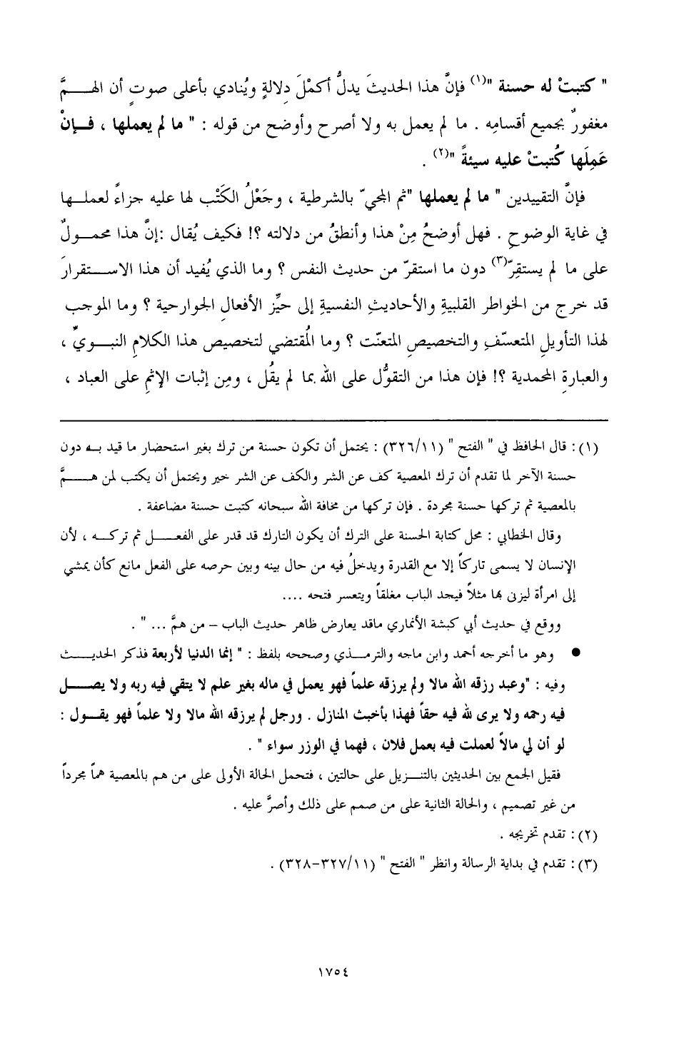 وقال بعض هؤلاء العالمين بالفرق بين ما استقر من حديث النفس وما لم يستقر بأنه يمكن إدخال الحديث المستقر تحت قوله: "ما لم تعمل"! وما أبعد هذا! وأن العمل والتكلم هما قسيم حديث النفس ومقابلاه، كما في حديث: "الهم بالسيئة" وهما أيضًا الغاية التي ينتهي عندها التجاوز! وكل عربي أو فاهم للغة العرب يفهم من هذا التركيب المذكور في الحديث، وهو أنه لو قال قائل: قد تجاوزت عن كل من حدث نفسه بشتمي ما لم يتكلم بالشتم أو يعمل عملًا يدل عليه.