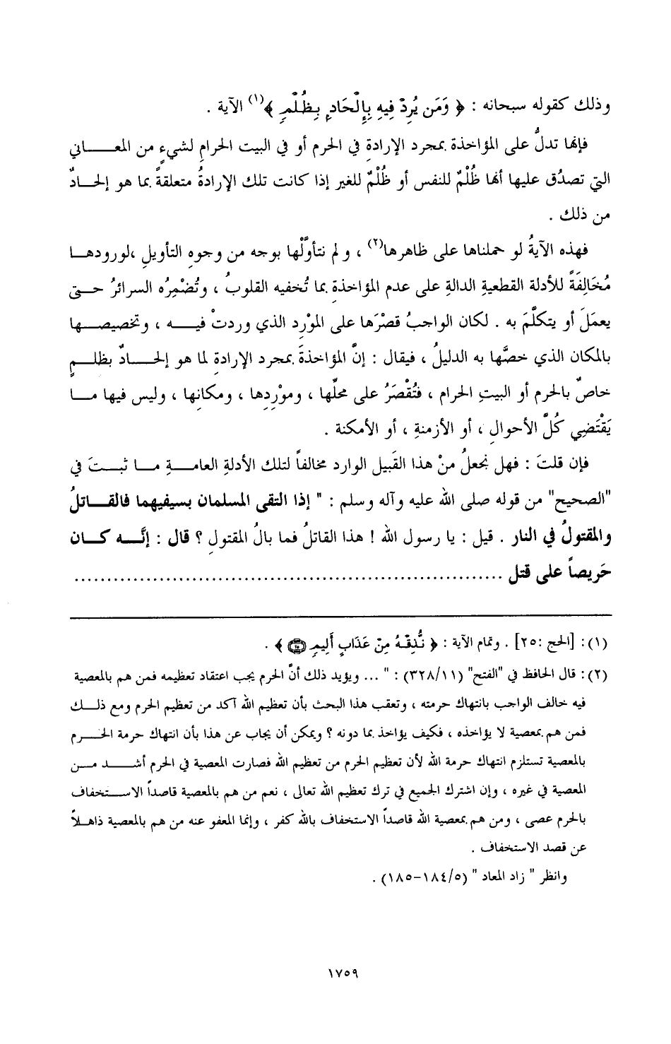 وقال الحافظ في "الفتح" (13/ 34): واستدل بقوله "إنه كان حريصًا على قتل صاحبه" من ذهب إلى المؤاخذة بالعزم وإن لم يقع الفعل وأجاب من لم يقل بذلك أن في هذا فعلاً وهو المواجهة بالسلاح ووقوع القتال، ولا يلزم من كون القاتل والمقتول في النار أن يكون في مرتبة واحدة، فالقاتل يعذب على القتال والقتل، والمقتول يعذب على القتال فقط، فلم يقع التعذيب على العزم المجرد.