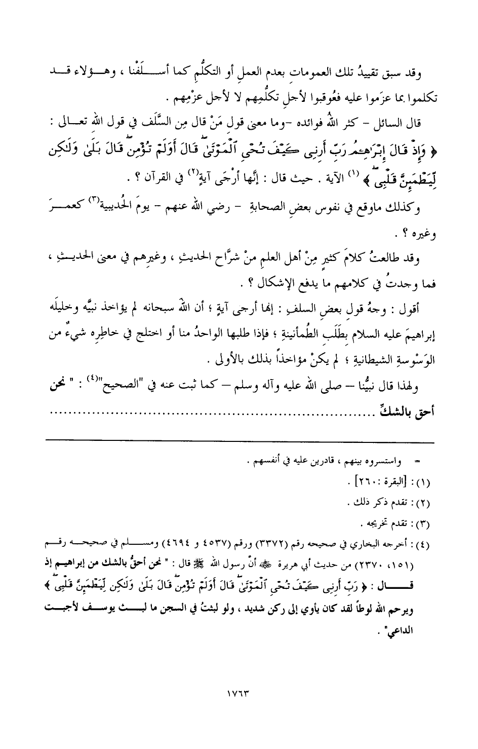 (¬1) قال الحافظ في "الفتح" (6/ 412): ثم اختلفوا في معنى قوله صَلَّى اللهُ عَلَيْهِ وَسَلَّمَ: "نحن أحق بالشك" فقال بعضهم: معناه نحن أشد اشتياقا إلى رؤية ذلك من إبراهيم، وقيل معناه إذا لم نشك نحن فإبراهيم أولى أن لا يشك، أي لو كان الشك متطرقا إلى الأنبياء لكنت أنا أحق به منهم. وقد علمتم أني لم أشك فاعلموا أنه لم يشك، وإنما قال ذلك تواضعا منه، أو من قبل أن يعلمه الله بأنه أفضل من إبراهيم، وهو كقوله في حديث أنس عند مسلم: "أن رجلا قال للنبي صَلَّى اللهُ عَلَيْهِ وَسَلَّمَ: يا خير البرية قال ذاك إبراهيم، وقيل أن سبب هذا الحديث أن الآية لما نزلت قال بعض الناس: شك إبراهيم ولم يشك نبينا فبلغه ذلك فقال: نحن أحق بالشك من إبراهيم.
