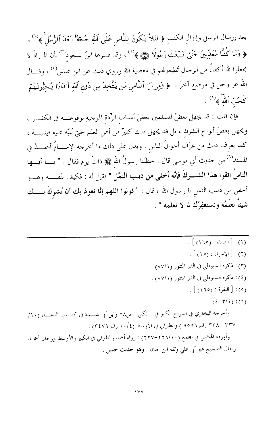 فإن قلت: قد يجهل بعض المسلمين بعض أسباب الردة الموجبة لوقوعه في الكفر، ويجهل بعض أنواع الشرك، بل قد يجهل ذلك كثير من أهل العلم حتى ينبه عليه فينتبه، كما يعرف ذلك من عرف أحوال الناس. ويدل على ذلك ما أخرجه الإمام أحمد في المسند (¬6) من حديث أبي موسى قال: خطبنا رسول الله صَلَّى اللهُ عَلَيْهِ وَسَلَّمَ ذات يوم فقال: "يا أيها الناس اتقوا هذا الشرك فإنه أخفى من دبيب النمل " فقيل له: فكيف نتقيه وهو أخفى من دبيب النمل يا رسول الله، قال: " قولوا اللهم إنا نعوذ بك أن نشرك بك شيئا نعلمه ونستغفرك لما لا نعلمه ".
