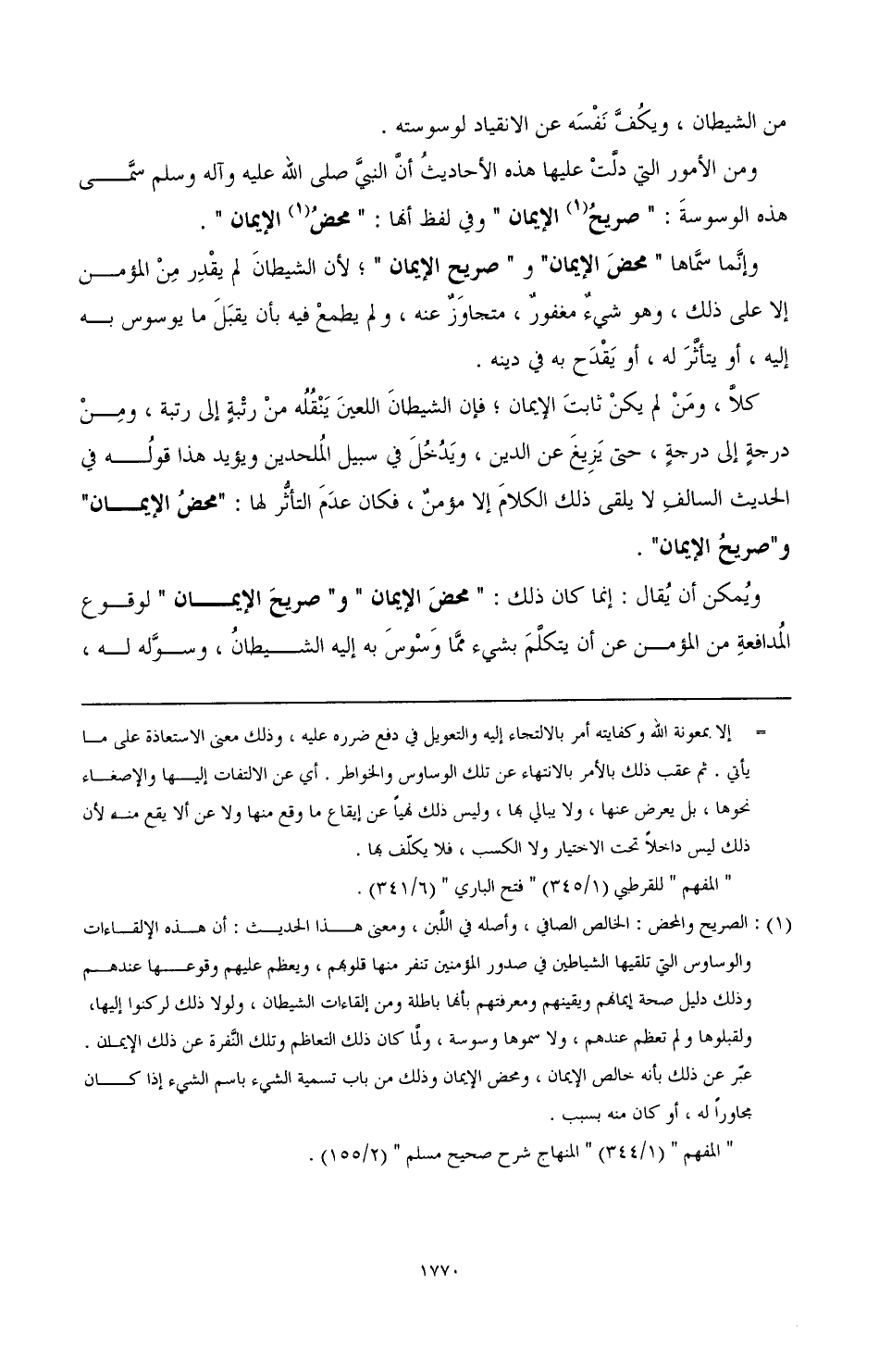 فالمؤمن إذا بلغ من تحفظه إلى هذا الحد، حتى يكون سقوطه من الثريا إلى الثرى، أخف عنده من التكلم به، وصار احتراقه بالنار التي يكون حممة أيسر عنده من ذلك، فلا رتبة أعلى من هذه الرتبة من الإيمان، ولا صلابة في الدين أقوى من هذه الصلابة؛ فيستحق إيمان من كان كذلك أن يكون "محض الإيمان" و"صريح الإيمان".