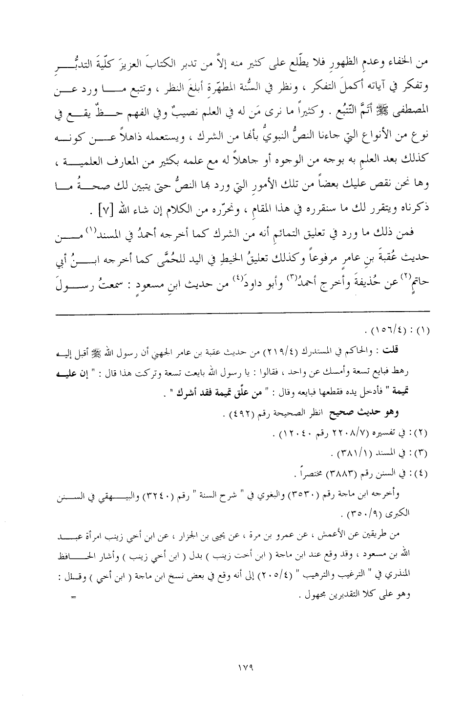 فمن ذلك ما ورد في تعليق التمائم أنه من الشرك كما أخرجه أحمد في المسند (¬1) من حديث عقبة بن عامر مرفوعا وكذلك تعليق الخيط في اليد للحمى كما أخرجه ابن أبي حاتم (¬2) عن حذيفة وأخرج أحمد (¬3) وأبو داود (¬4) من حديث ابن مسعود: سمعت رسول