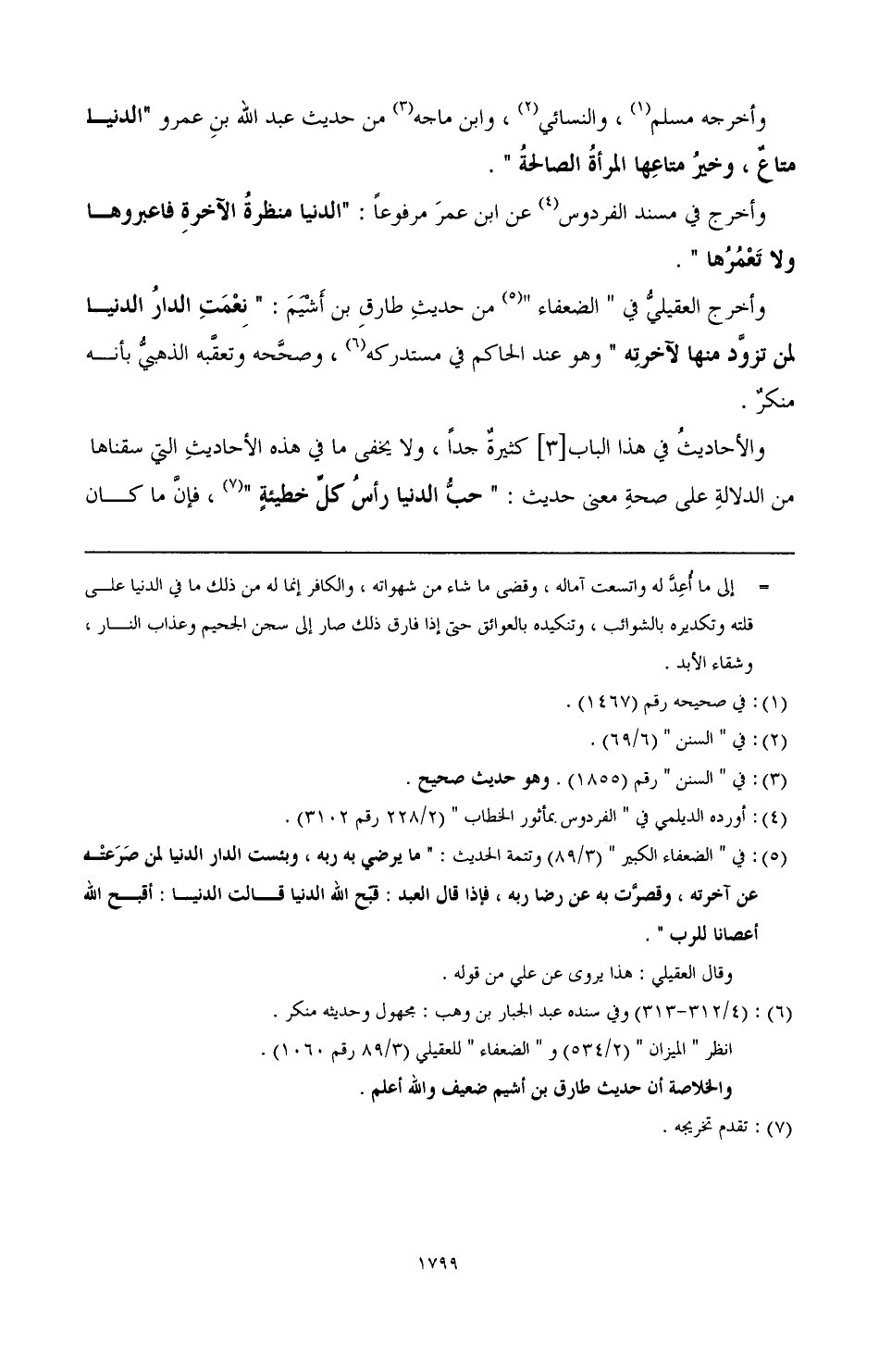 من هذه الأحاديث وغيرها متضمنا لذم الدنيا والتنفير منها ففيه دليل على أنها لا تكون محلا للمحبة، وأن حبها وهي بهذه المثابة وسيلة للخطيئة، وما كان منها متضمنا لمدحها أو إباحة الانتفاع بها فهو مقيد يفيد مسوغ للتناول، وليس فيه ما يفيد أنها محل للمحبة.