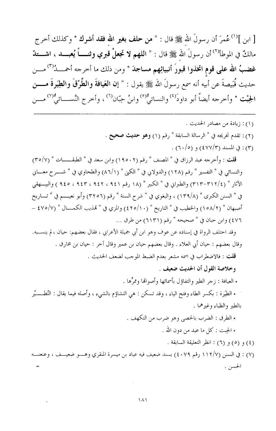 [ابن] (¬1) عمر أن رسول الله صَلَّى اللهُ عَلَيْهِ وَسَلَّمَ قال: " من حلف بغير الله فقد أشرك " وكذلك أخرج مالك في الموطأ (¬2) أن رسول الله صَلَّى اللهُ عَلَيْهِ وَسَلَّمَ قال: " اللهم لا تجعل قبري وثنا يعبد، اشتد غضب الله على قوم اتخذوا قبور أنبيائهم مساجد " ومن ذلك ما أخرجه أحمد (¬3) من حديث قبيصة عن أبيه أنه سمع رسول الله صَلَّى اللهُ عَلَيْهِ وَسَلَّمَ يقول: " إن العيافة والطَّرْق والطيرة من الجبت " وأخرجه أيضًا أبو داود (¬4) والنسائي (¬5) وابن حبان (¬6)، وأخرج النسائي (¬7) من