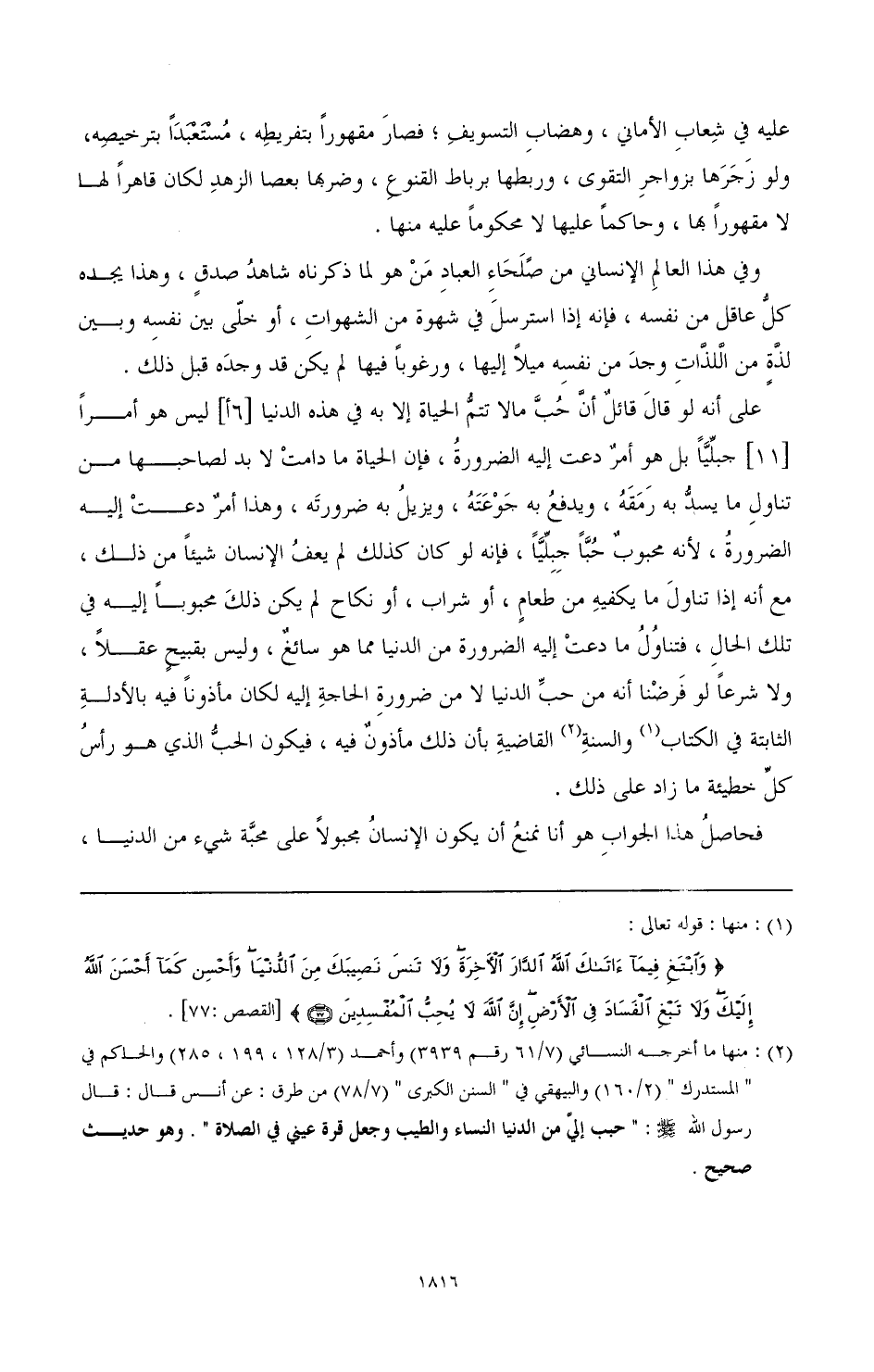 وما توجبه الضرورة من سد الجوعة ونقع الغلة ليس من المحبة في شيء، بل ذلك أمر أوجبته الضرورة، ولو سلمنا أن هذا القدر الذي تدعو إليه الضرورة متلازم هو والمحبة لم يرد الاعتراض بذلك، فإن الشارع قد أذن فيه، وإنما الممنوع المذموم ما تتسبب عنه الخطايا، وهو ما زاد على ذلك.