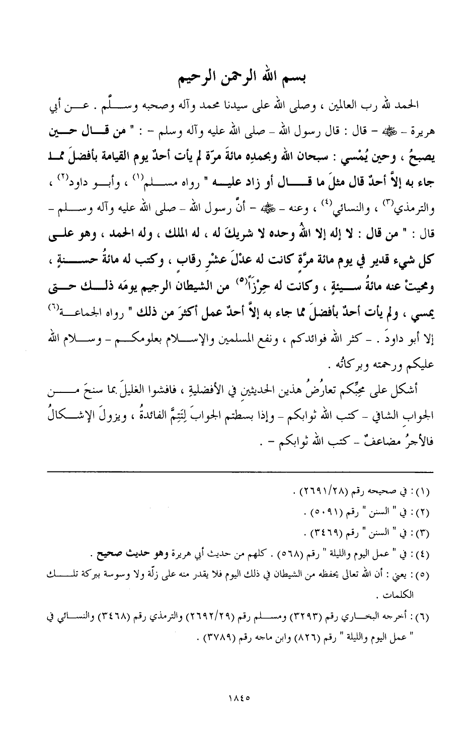 (¬1) قال النووي في شرحه لصحيح مسلم (17/ 17 - 18): هذا فيه دليل على أنه لو قال هذا التهليل أكثر من مائة مرة في اليوم كان له هذا الأجر المذكور في الحديث على المائة، ويكون له ثواب آخر على الزيادة، وليس هذا من الحدود التي نهى عن اعتدائها ومجاوزة أعدادها، وإن زيادتها لا فضل فيها أو تبطلها كالزيادة في عدد الطهارة وعدد ركعات الصلاة.