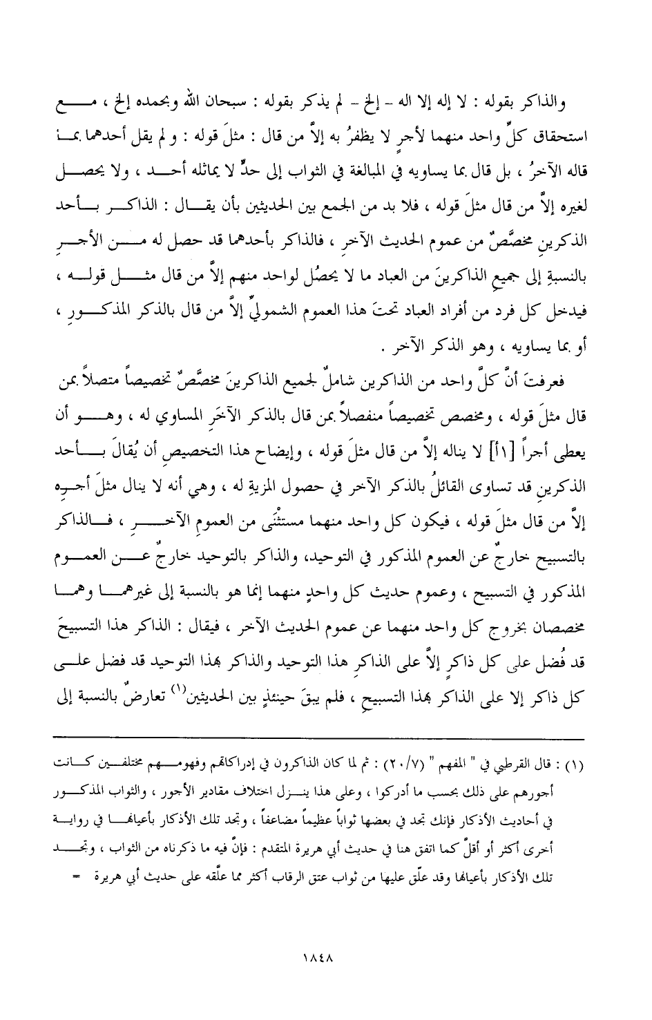 هذا على تقدير أن المبالغة في كل واحد منهما إلى حد لا يأتي بمثل أجره لا من قال مثل قوله يوجب الاشتراك بينهما في أن أجر كل واحد منهما بمنزلة عظيمة، ومزية جليلة محدودة هذا الحد، وقد فعل كل واحد منهما ما يقتضي ذلك، فالمصير إلى التخصيص لا بد منه، أما لو فرضنا أن اتحادهما في تلك المزية لا توجب تساويهما، بل أجر كل واحد منهما مختص بالذكر الذي جاء به، فتكون مزية المسبح بالنسبة إلى المسبحين، ومزية الموحد بالنسبة إلى الموحدين، فلا تعارض بين الحديثين، بل أجر ذلك المسبح بذلك التسبيح قد فضل كل متعرب، ويدخل في ذلك الموحد؛ لأنه لم يأت بذكر التسبيح، وأجر الموحد قد فضل كل متعرب، ويدخل في ذلك المسبح بذلك التسبيح؛ لأنه لم يأت بذكر التوحيد، فعرفت بهذا أن لك في الكلام على الجمع بين الحديثين وجهين يزول الإشكال بكل واحد منهما.