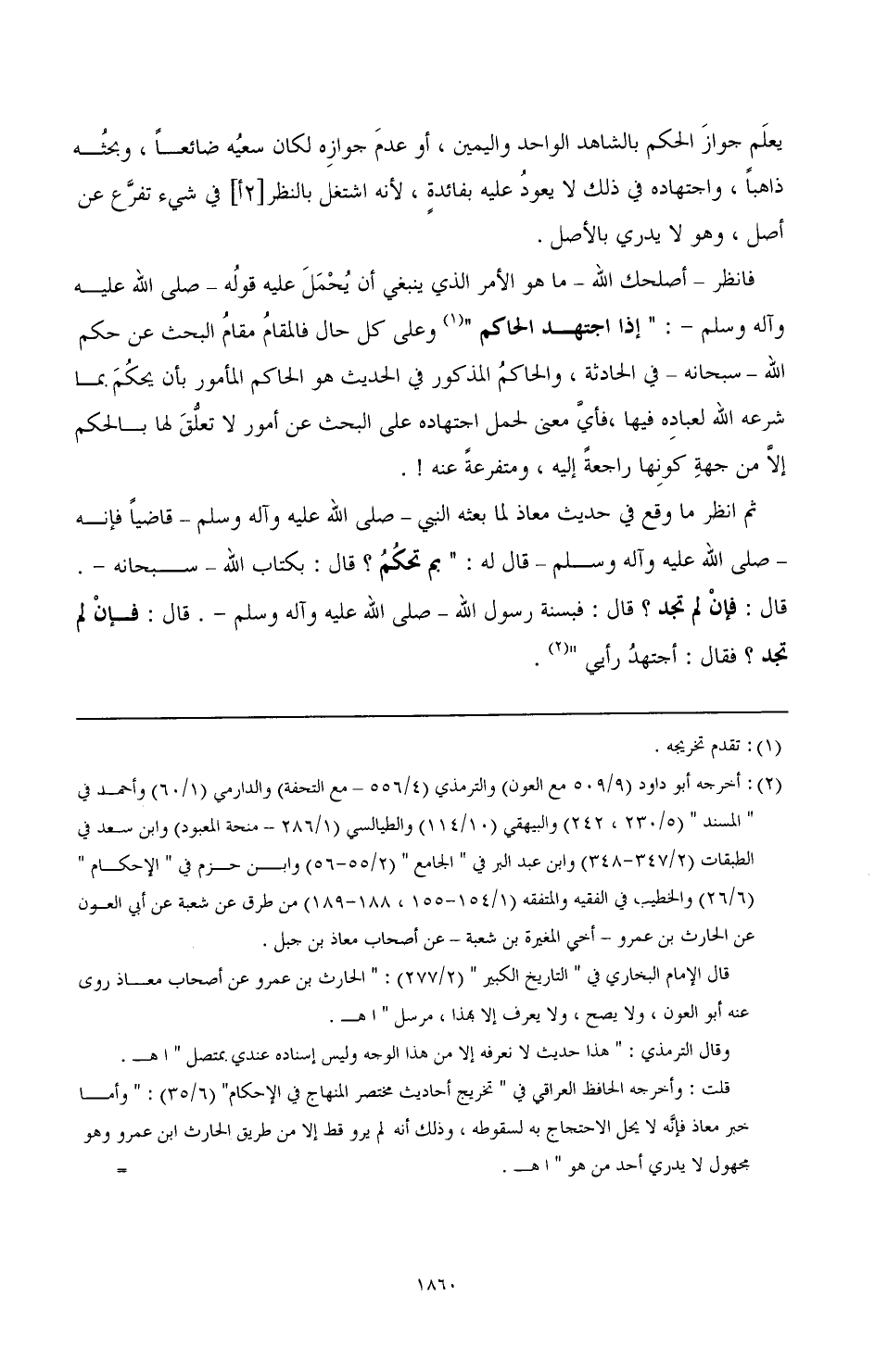 فانظر كيف كان الأمر المهم عند بعث هذا الصحابي للقضاء؟ هو السؤال له للإرشاد لا للاسترشاد عن مستند ما يحكم به لا عن غيره، وهكذا كان صَلَّى اللهُ عَلَيْهِ وَآلِهِ وَسَلَّمَ يأمر من يبعثه من القضاة والولاة، وكذلك كان يرشد إلى ذلك معظم الخلفاء الراشدون (¬1) من يبعثونه، ثم انظر قول هذا الصحابي العظيم: أجتهد رأيي، فإن المراد بلا