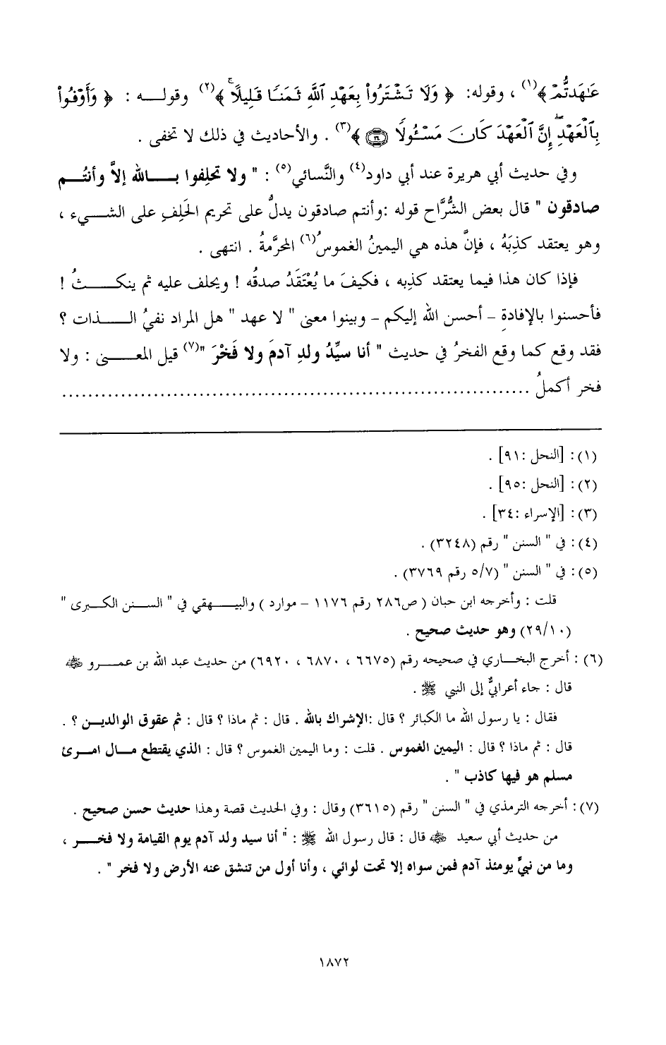 منه (¬1)، أو ما يلازمها نحو يجب الوفاء به، أو يوجب الحنث فما المخصص، فالأدلة الصحيحة على أن كل عهد يجب الوفاء به أو التكفير عنه، وذلك كما يكون إتيانه عملا (¬2) من أعمال البر، وهو معنى: {ولا تجعلوا الله عرضة لأيمانكم} (¬3) في وجه، وعلى فرض صحة هذا الحديث فهو لا يقوى لمعارضة غيره، ثم هل المراد بالظالم الحالف بمعنى أن حلفه وفجوره من جملة الظلم أو المراد المحلوف له؟ قال الله سبحانه: {ولا تركنوا إلى الذين ظلموا فتمسكم النار} (¬4) والركون الميل