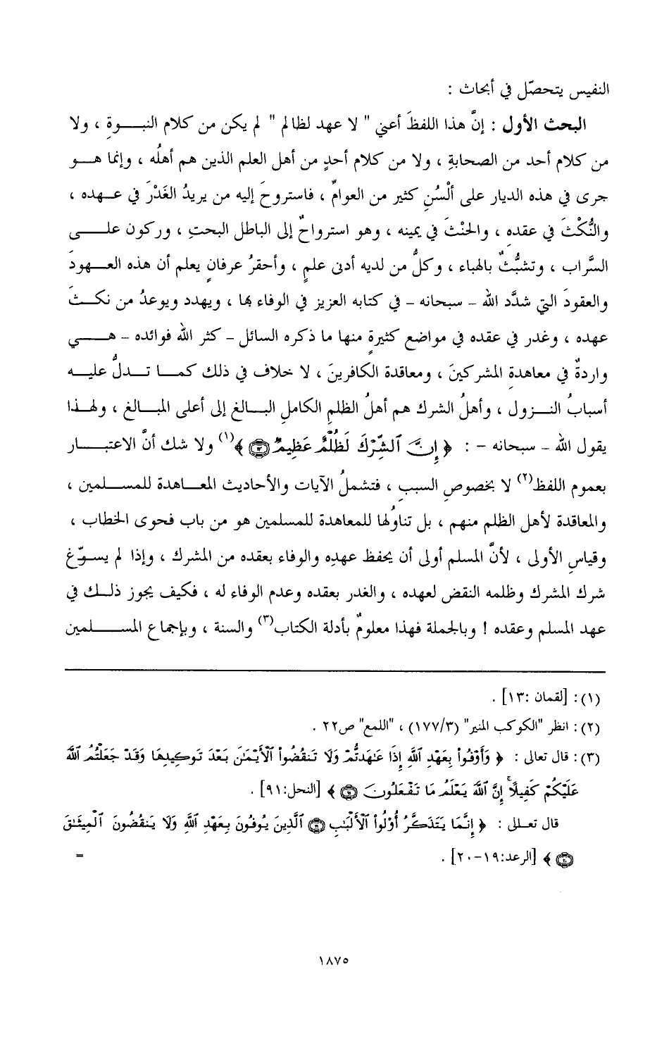 أجمعين، لا يعرف عن أحد منهم في ذلك خلاف، وكما اتفقوا على تحريم الغدر وترك الوفاء بالعهد فقد اتفقوا على أن الأحاديث الصحيحة الواردة [1 ب] في أن الغدر في العهد من خصال المنافقين، وأنه يدخل عهد المسلم للمسلم تحت ذلك دخولا أوليا، وكذلك اتفقوا على أن ما ورد في الأحاديث الصحيحة أنه ينصب لكل غادر لواء يوم القيامة (¬1)، ويقال: هذه غدرة فلان، يتناول عهد المسلم للمسلم تناولا أوليا لا شك في هذا ولا ريب، والحاصل أن الوفاء بالعهود، وعدم جواز نكثها، والمخالفة لمضمونها، هو قطعي من قطعيات الشريعة.
