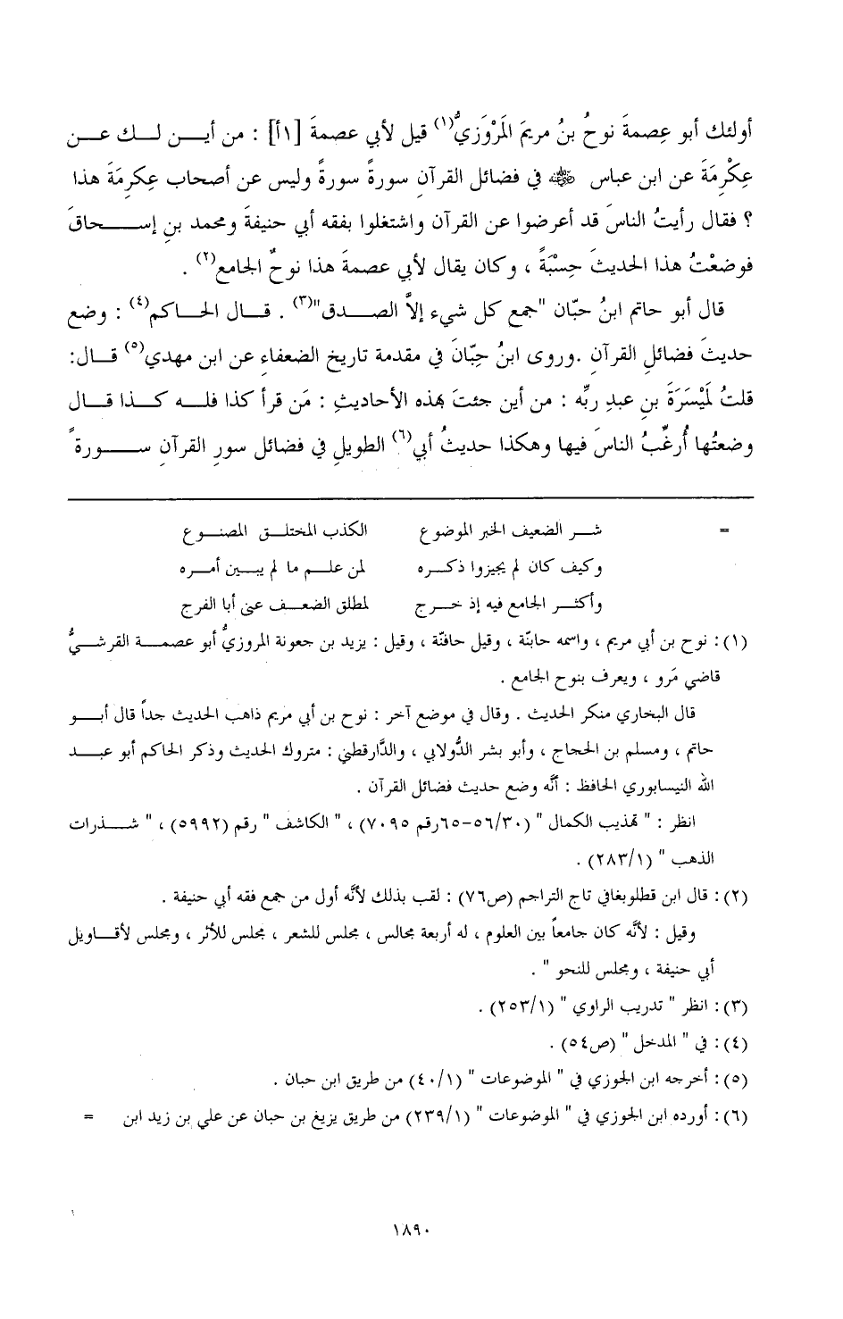سورة فروينا عن المؤمل بن إسماعيل: حدثني به شيخ بكذا، فسرت إليه فقلت من حدثك قال حدثني شيخ بالبصرة وهو حي فسرت إليه فقال حدثني شيخ ببغداد فسرت إليه فأخذ بيدي وأدخلني بيتًا فإذا فيه قوم من المتصوفة فيهم شيخ فقال هذا حدثني. فقلت يا شيخ من حدثك؟ قال لم يحدثني به أحد ولكنا رأينا الناس قد رغبوا عن القرآن فوضعنا لهم هذا الحديث فيصرفون قلوبهم إلى القرآن.