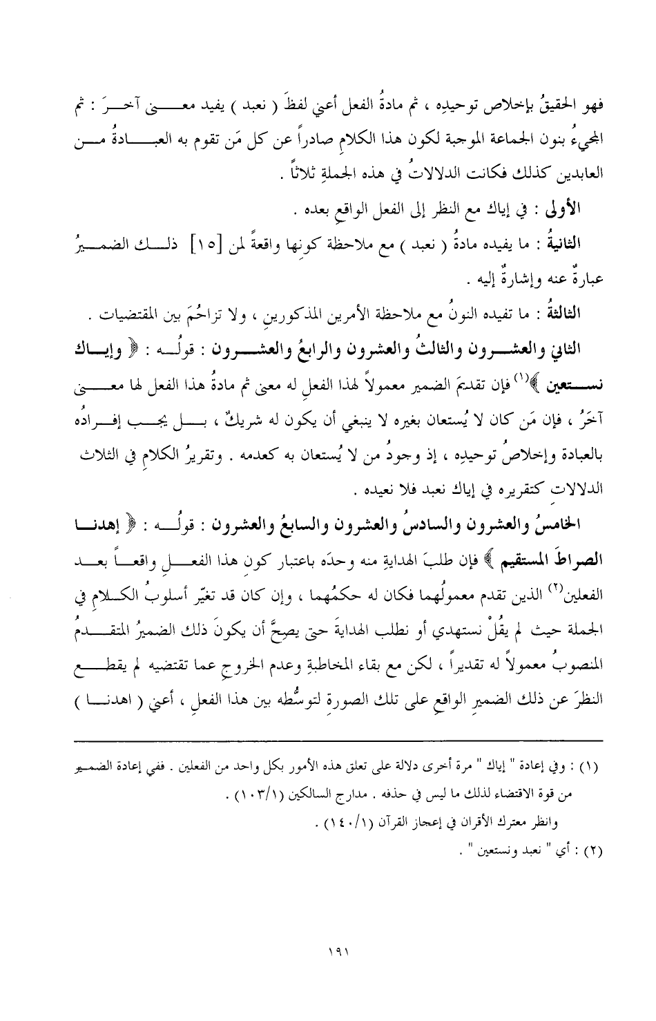 (¬1) وفي إعادة " إياك " مرة أخرى دلالة على تعلق هذه الأمور بكل واحد من الفعلين. ففي إعادة الضمير من قوة الاقتضاء لذلك ما ليس في حذفه. مدارج السالكين (1/ 103).