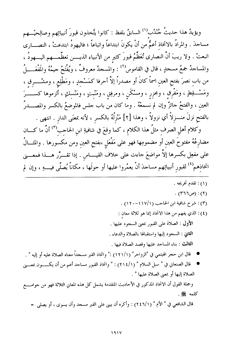 وأما على ما روي عن سيبويه (¬1) أن المسجد بفتح الجيم لمكان السجود، وبكسرها للمكان المعروف؛ فإن كان لفظ مساجد في الحديث جمعًا لمسجد بكسر الجيم فالكلام كما تقدم، وإن كان جمعًا لمسجد بفتح الجيم فالمحرم إنما هو اتخاذ القبر نفسه مكانًا يسجد عليه، فيكون عمارة المساجد في القبور من ذلك القبيل، من غير فرق بين كون القبر في جهة القبلة أو في غيرها، هذا ما يتعلق بمتن الحديث من الكلام.