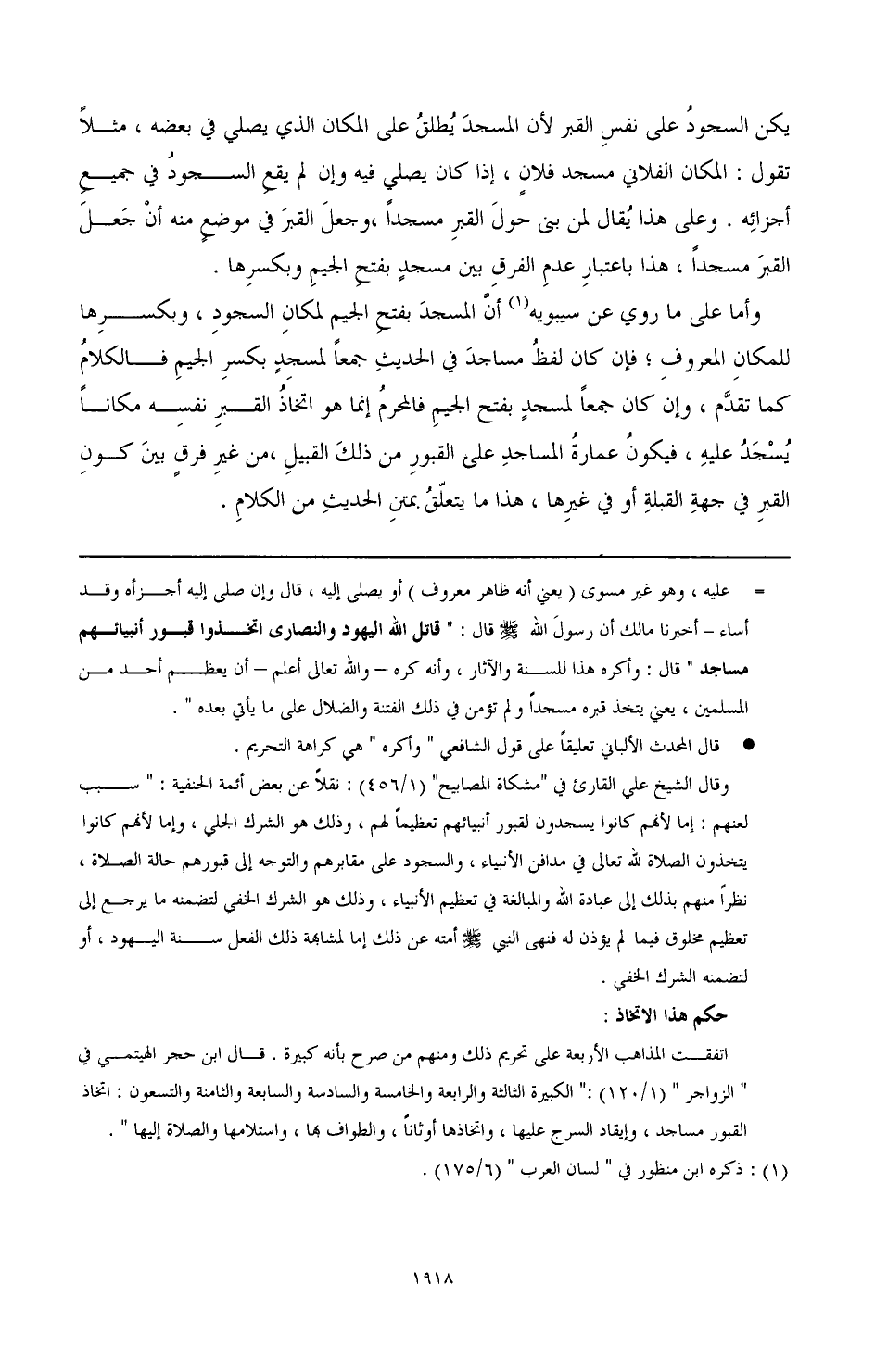 وقد حمل بعضهم الوعيد على من كان في ذلك الزمان لقرب العهد بعبادة الأوثان، وهو تقييد بلا دليل، لأن التعظيم والافتتان لا يختصان بزمان دون زمان، أو مكان دون مكان، فعليه البرهان. وقد قيل إنه يؤخذ من قوله: كانوا يتخذون [3] قبور أنبيائهم مساجد كما في بعض أحاديث الباب، ومن قوله: والمتخذين عليها المساجد كما في بعض آخر أن محل الذم على ذلك أن تتخذ المساجد على القبور بعد الدفن لا لو بني