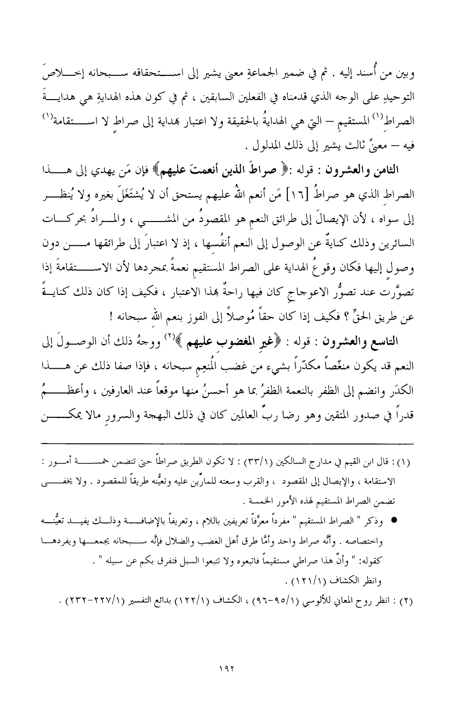 (¬1) قال ابن القيم في مدارج السالكين (1/ 33): لا تكون الطريق صراطا حتى تتضمن خمسة أمور: الاستقامة، والإيصال إلى المقصود، والقرب وسعته للمارين عليه وتعينه طريقا للمقصود. ولا يخفى تضمن الصراط المستقيم لهده الأمور الخمسة.