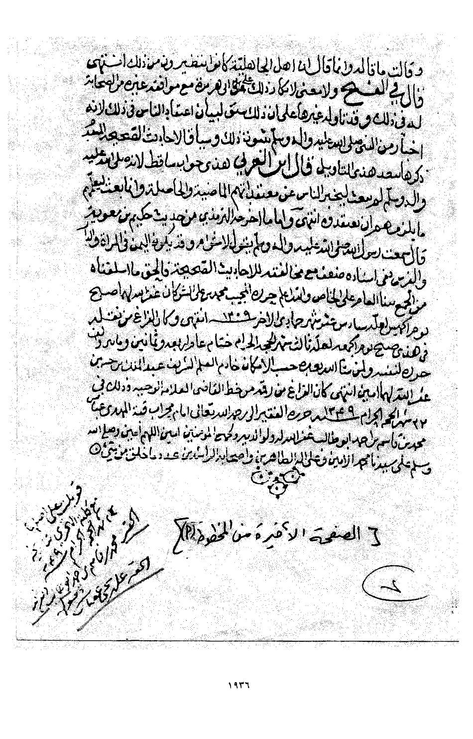 4 - آخر الرسالة: للأحاديث الصحيحة فالحق ما أسلفناه من الجمع بين العام والخاص والله أعلم. انتهى من تحرير المجيب محمد بن علي الشوكاني غفر الله لهما في صبح يوم الخميس لعله سادس عشر شهر جمادى الآخرة سنة 1209 هـ.