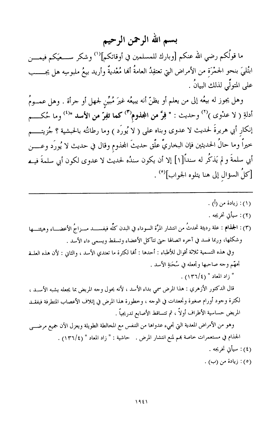 فأقول وبالله أستعين: حديث "لا عدوى ولا طيرة" أخرجه الشيخان (¬1) من حديث أبي سلمة عن أبي هريرة قال: قال رسول الله - صَلَّى اللهُ عَلَيْهِ وَآلِهِ وَسَلَّمَ -: "لا عدوى ولا طيرة ولا صفر ولا هامة"، فقال أعرابي: ما بال الإبل تكون في الرمل كأنها الظباء فيخالطها البعير الأجرب فيجربها قال: "فمن أعدى الأول؟ ".