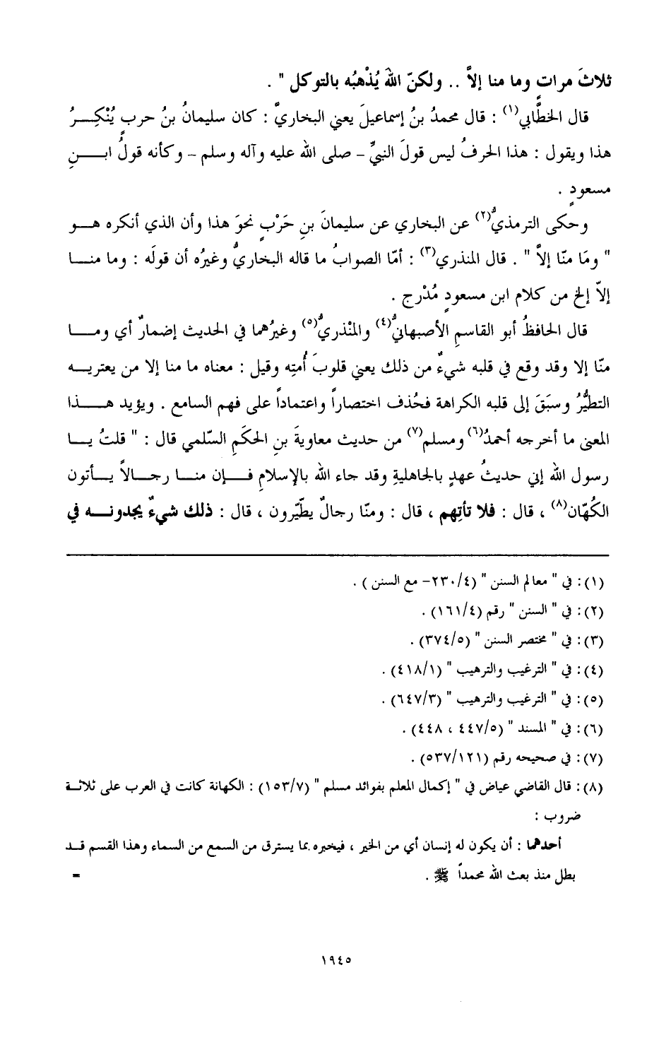 وإنما جعل الطيرة في هذا الحديث من الشرك لأنهم كانوا يعتقدون أن التطير يجلب لهم نفعًا أو يدفع عنهم ضررًا إذا عملوا بموجبه فكأنهم أشركوه مع الله تعالى، ومعنى إذهابه بالتوكل أن ابن آدم إذا تطير وعرض له خاطر من التطير أذهبه الله بالتوكل والتفويض إليه وعدم العمل بما خطر من ذلك، فمن توكل سلم من ذلك ولم يؤاخذه الله بما عرض له من التطير.