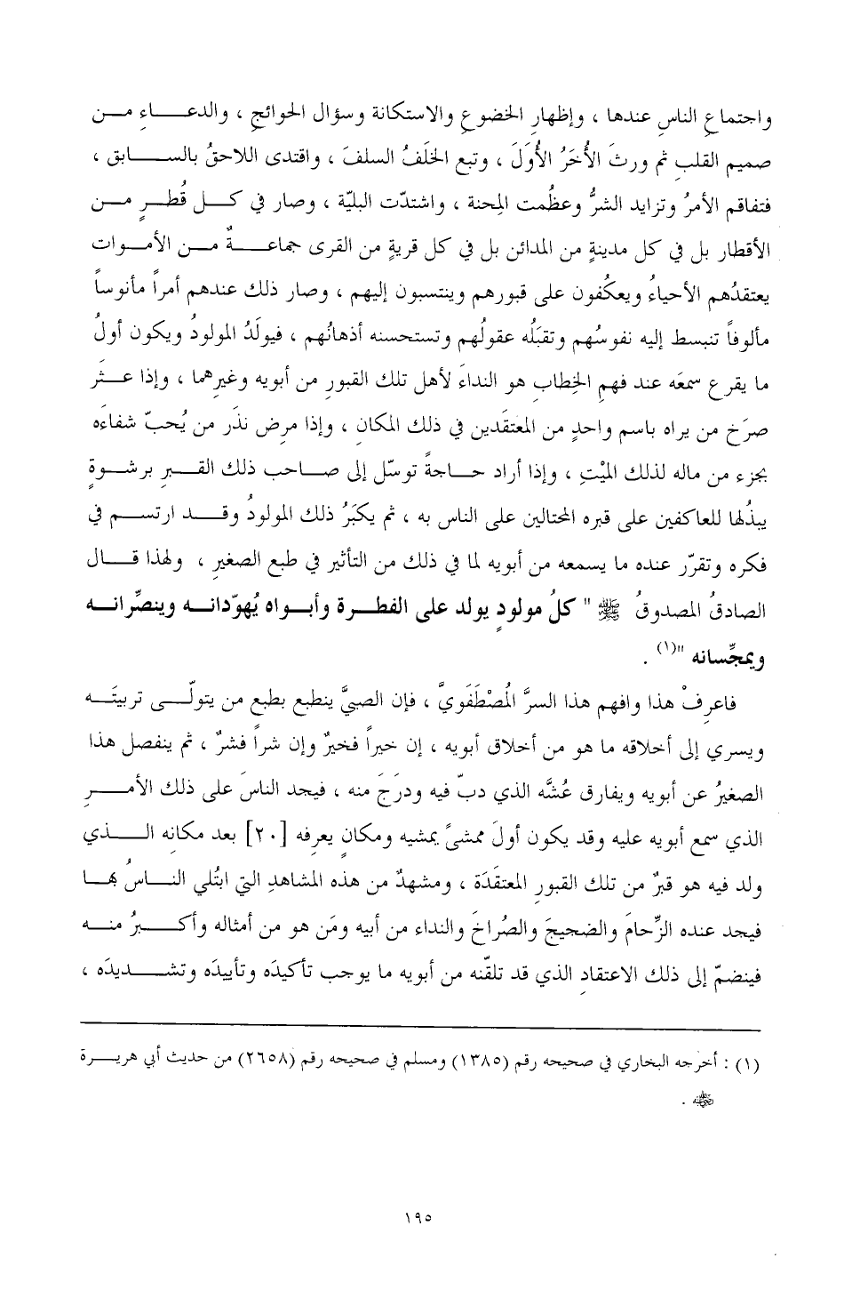 فاعرف هذا وافهم هذا السر المصطفوي، فإن الصبي ينطبع بطبع من يتولى تربيته ويسري إلى أخلاقه ما هو من أخلاق أبويه، إن خيرا فخير وإن شرا فشر، ثم ينفصل هذا الصغير عن أبويه ويفارق عشه الذي دب فيه ودرج منه، فيجد الناس على ذلك الأمر الذي سمع أبويه عليه وقد يكون أول ممشى يمشيه ومكان يعرفه [20] بعد مكانه الذي ولد فيه هو قبر من تلك القبور المعتقَدَة، ومشهد من هذه المشاهد التي ابتلي الناس بها فيجد عنده الزحام والضجيج والصراخ والنداء من أبيه ومن هو من أمثاله وأكبر منه فينضم إلى ذلك الاعتقاد الذي قد تلقنه من أبويه ما يوجب تأكيده وتأييده وتشديده،