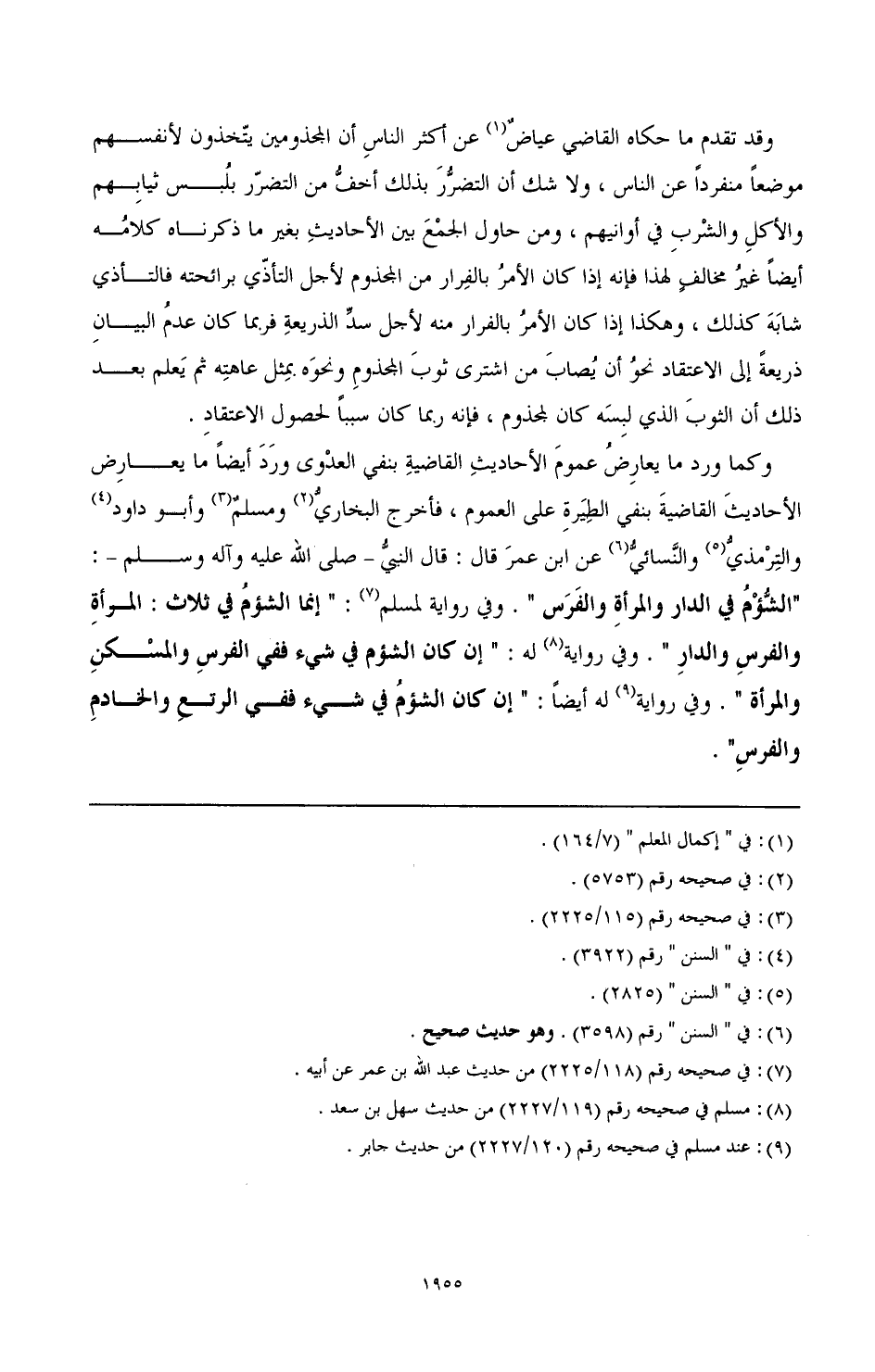 قال النووي (¬10) اختلف العلماء في حديث: الشؤم في ثلاث، فقال مالك - رحمه الله - هو على ظاهره وإن الدار قد يجعل الله تبارك وتعالى سكناها سببًا للضرر أو الهلاك، وكذا