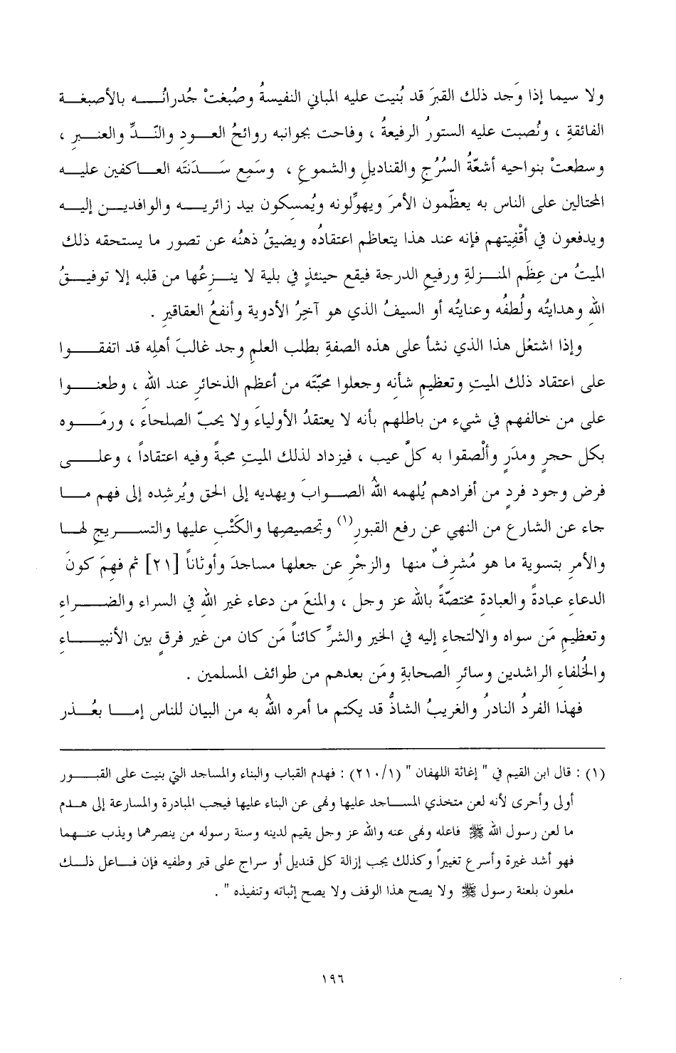 ولا سيما إذا وجد ذلك القبر قد بنيت عليه المباني النفيسة وصبغت جدرانه بالأصبغة الفائقة، ونصبت عليه الستور الرفيعة، وفاحت بجوانبه روائح العود والند والعنبر، وسطعت بنواحيه أشعة السرج والقناديل والشموع، وسمع سدنته العاكفين عليه المحتالين على الناس به يعظمون الأمر ويهولونه ويمسكون بيد زائريه والوافدين إليه ويدفعون في أقفيتهم فإنه عند هذا يتعاظم اعتقاده ويضيق ذهنه عن تصور ما يستحقه ذلك الميت من عظم المنزلة ورفيع الدرجة فيقع حينئذ في بلية لا ينزعها من قلبه إلا توفيق الله وهدايته ولطفه وعنايته أو السيف الذي هو آخر الأدوية وأنفع العقاقير.
