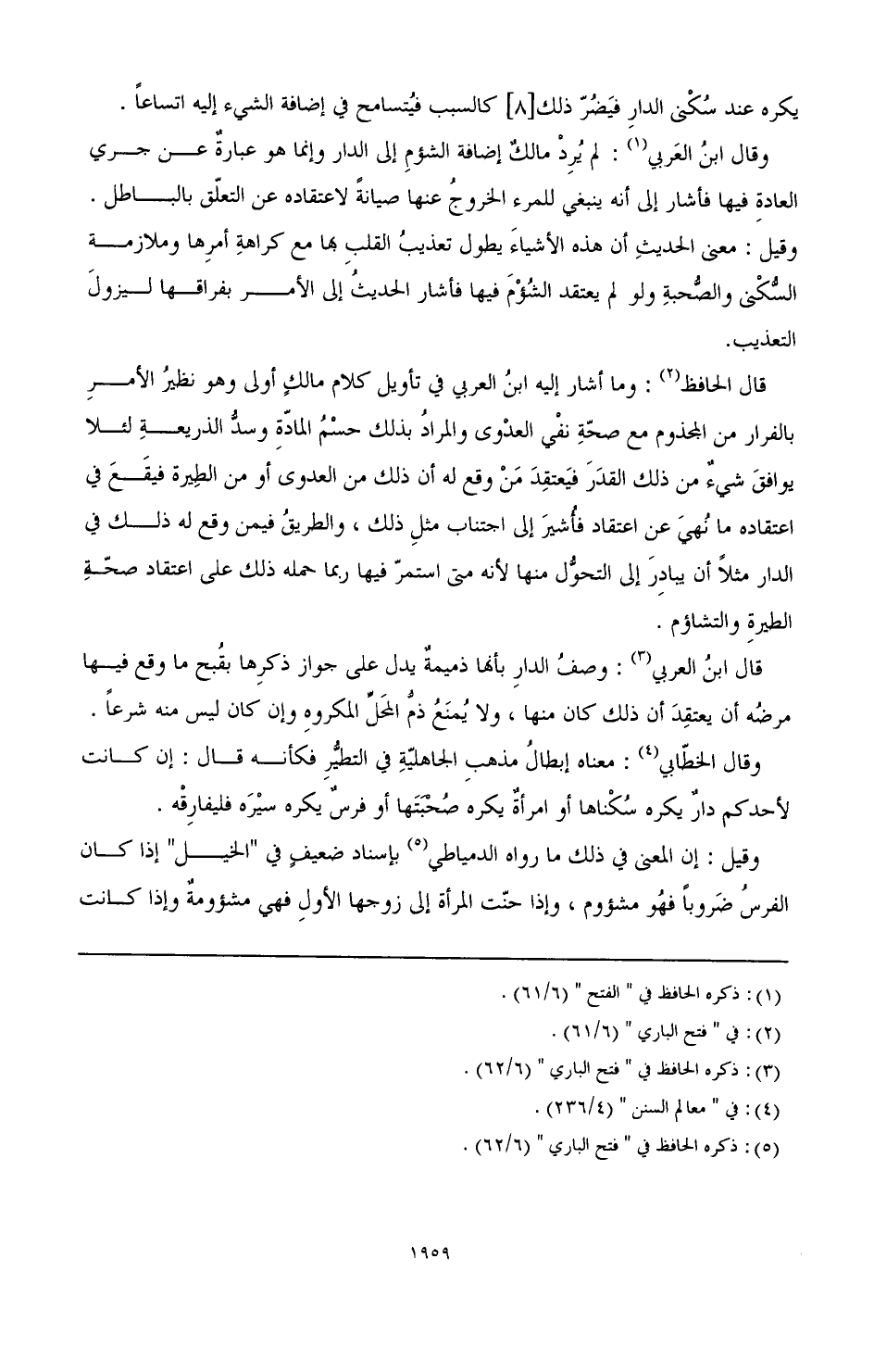 الدار بعيدة من المسجد فلا يسمع فيها الآذان فهي مشؤومة. وقيل: كان ذلك في أول الأمر ثم نسخ بقوله تعالى: {مَا أَصَابَ مِنْ مُصِيبَةٍ فِي الْأَرْضِ وَلَا فِي أَنْفُسِكُمْ إِلَّا فِي كِتَابٍ} (¬1)، حكاه ابن عبد البر (¬2).