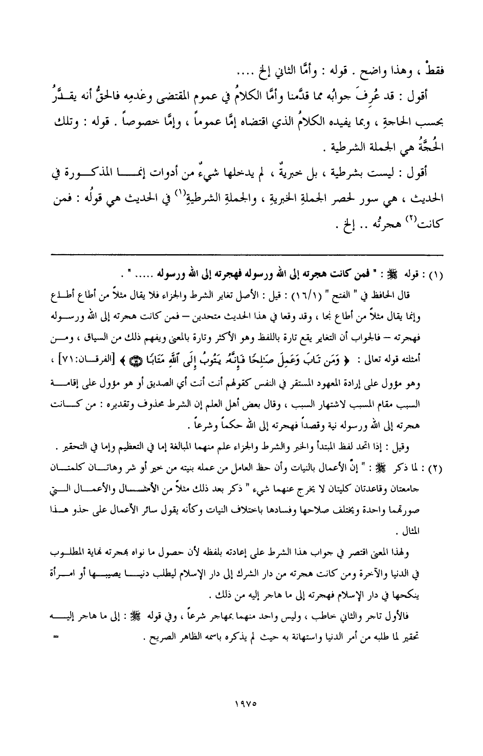 (¬1) قال ابن القيم في "إعلام الموقعين" (3/ 123): "والنية روح العمل ولبه وقوامه وهو تابع لها يصح بصحتها ويفسد بفسادها. والنبي - صَلَّى اللهُ عَلَيْهِ وَسَلَّمَ - قد قال كلمتين كفتا وشفتا وتحتهما كنوز العلم وهما "إنما الأعمال بالنيات وإنما لكل امرئ ما نوى" فبين في الجملة الأولى أن العمل لا يقع إلا بالنية ولهذا لا يكون عمل إلا بنية، ثم بين في الجملة الثانية أن العامل ليس له من عمله إلا ما نواه وهذا يعم العبادات والمعاملات والأيمان والنذور وسائر العقود والأفعال، وهذا دليل على أن من نوى بالبيع عقد الربا حصل له الربا ولا يعصمه من ذلك صورة البيع، وأن من نوى بعقد النكاح التحليل كان محللا ولا يخرجه من ذلك صورة عقد النكاح".