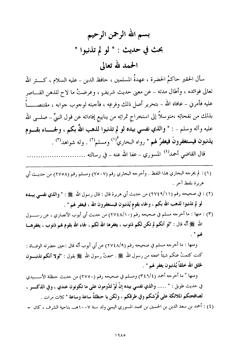 المعروفة (¬1) مشككا في شأن ما لاح له في تناقض الأدلة، حرس الله ذلك عنه، ومن ذلك قول النبي - صَلَّى اللهُ عَلَيْهِ وَآلِهِ وَسَلَّمَ -: "والذي نفسي بيده .. إلخ". مع قول الله تعالى: {وإن تتولوا يستبدل قوما غيركم} (¬2) هذا تناقض.