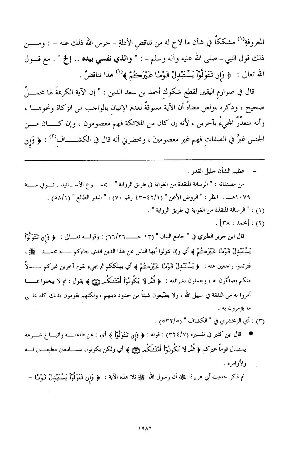 {وإن تتولوا} معطوف على: {وإن تؤمنوا وتتقوا} فيكون المراد بالتولي الكفر، وهو غير ما أراده صاحب الرسالة من أن المراد عدم الذنب، بل أعم من ذلك.