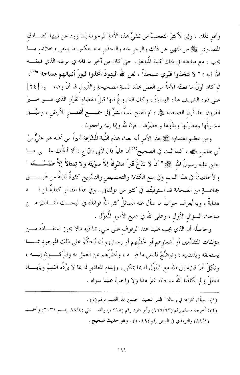 ومن عظيم اهتمامه صَلَّى اللهُ عَلَيْهِ وَسَلَّمَ هذا الأمر أنه بعث بهدم القبة المشرفة أميرا من أهله هو علي بن أبي طالب رضي الله عنه، كما ثبت في الصحيح (¬2) أن عليا قال لأبي الهياج: ألا أبعثك على ما بعثني عليه رسول الله صَلَّى اللهُ عَلَيْهِ وَسَلَّمَ "أن لا تدع قبرا مشرفا إلا سويته ولا تمثالا إلا طمسته" والأحاديث في هذا الباب وفي منع الكتابة والتجصيص والتسريج كثيرة ثابتة من طريق جماعة من الصحابة قد استوفيتها في كثير من مؤلفاتي. وفي هذا المقدار كفاية لمن له هداية، وبه يعرف جواب ما سأل عنه السائل كثر الله فوائده في البحث الثالث من مباحث السؤال الأول، وعلى الله في جميع الأمور المعول.