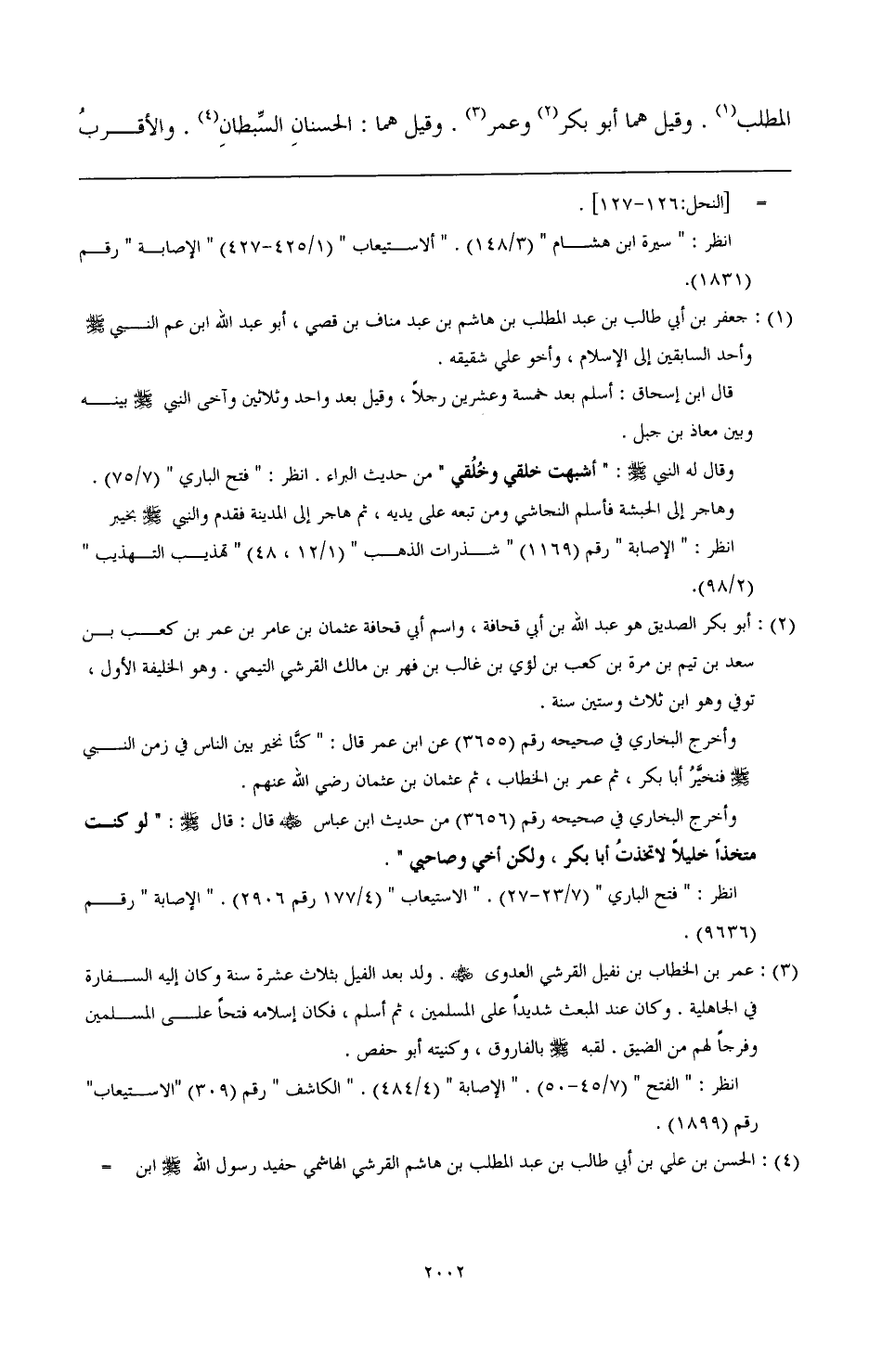 أنهما الحمزة وجعفر كما نقل ذلك السمهودي، لأن ظاهر قوله - صَلَّى اللهُ عَلَيْهِ وَسَلَّمَ - بعد العبدين الصالحين أنهما عند هذه المقالة غير موجودين، والأمر في الحمزة وجعفر. كذلك فإن الحمزة استشهد في يوم أحد (¬1)، وجعفر في يوم مؤتة (¬2).