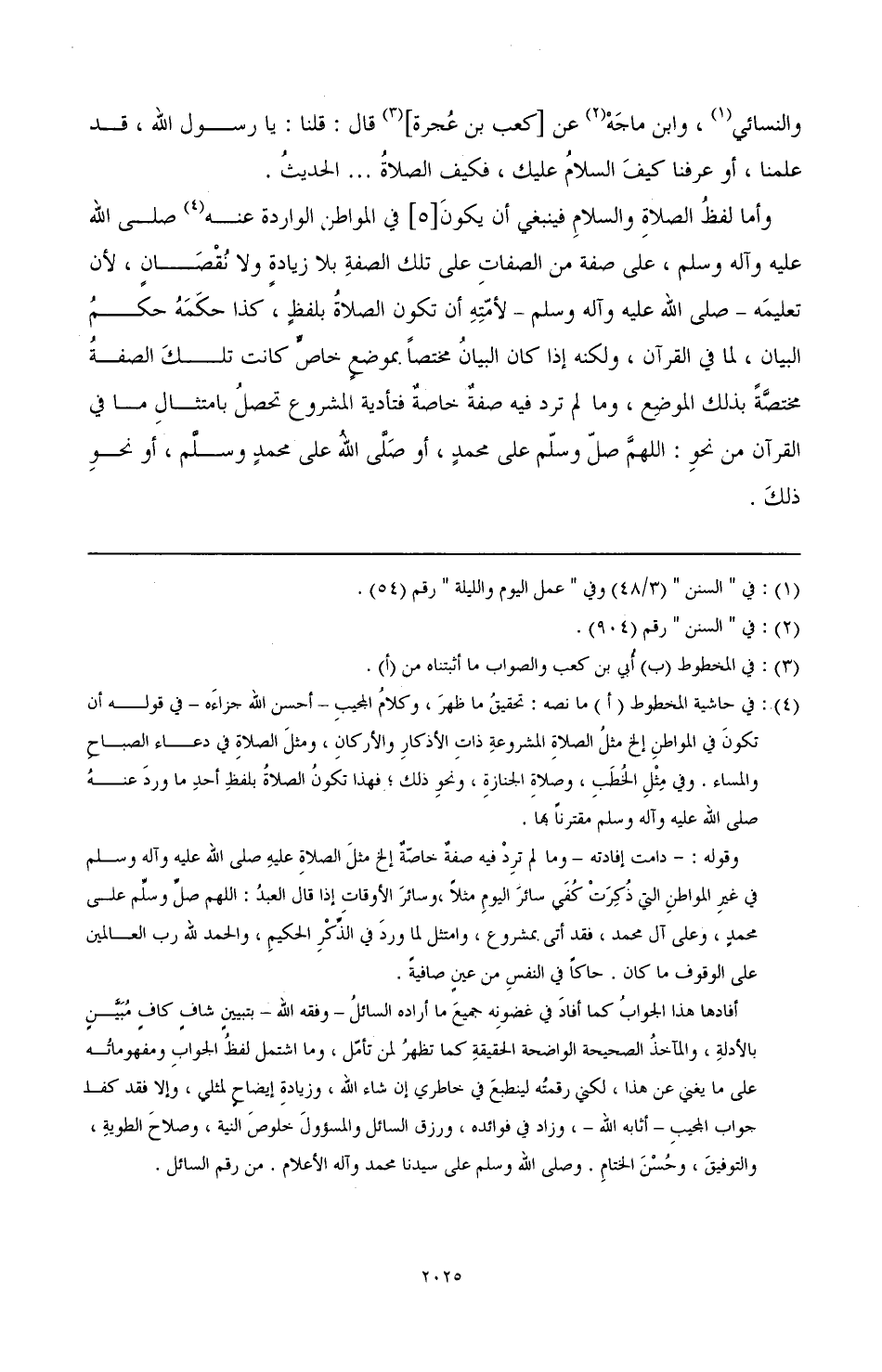 ولا شك أن الأحاديث المقيدة بالسلام، أو بذكر الآل بالنسبة إلى الأحاديث الخالية عنهما، أو عن أحدها، حكم المقيد بالنسبة إلى المطلق، ولكن بشرط أن لا تكون تلك الزيادة وذلك القيد مختصين بموضع مخصوص لا ينبغي مجاوزته إلى غيره، وبشرط أن يتحد المطلق والمقيد حكما وسببا، أو حكما (¬2) فقط، أو سببا فقط على حسب الخلاف المبسوط في الأصول (¬3)، وبهذا يظهر الجواب عن السؤال الثالث، أعني: قول السائل - حفظه الله - أن من جملة الألفاظ الواردة عنه - صَلَّى اللهُ عَلَيْهِ وَآلِهِ وَسَلَّمَ - في الصلاة: اللهم صل على محمد، وعلى آل محمد، فهل تجزئ المصلي إذا وسط التسليم؟ فقال: