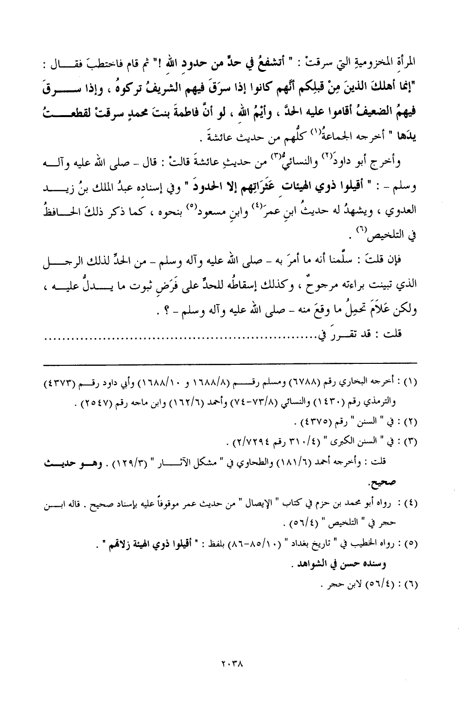 والرواية الثانية: لا يسقط وهو قول مالك، وأبي حنيفة، وأحد قولي الشافعي، لقول الله تعالى: (الزانية والزاني فاجلدوا كل واحد منهما مائة جلدة) [النور: 2]. وهذا عام في التائب وغيره، وقال تعالى: (والسارق والسارقة فاقطعوا أيديهما) [المائدة: 38]. ولأن النبي - صَلَّى اللهُ عَلَيْهِ وَسَلَّمَ - رجم ماعزا والغامدية، وقطع الذي أقر بالسرقة وقد جاءوا تائبين يطلبون التطهير بإقامة الحد، وقد سمى رسول الله - صَلَّى اللهُ عَلَيْهِ وَسَلَّمَ - فعلهم توبة، فقال في حق المرأة: "لقد تابت توبة لو قسمت على أهل المدينة لوسعتهم" تقدم تخريجه، وجاء عمرو بن سمرة إلى النبي - صَلَّى اللهُ عَلَيْهِ وَسَلَّمَ - فقال: يا رسول الله، إني سرقت جملا لبني فلان، فطهرني.