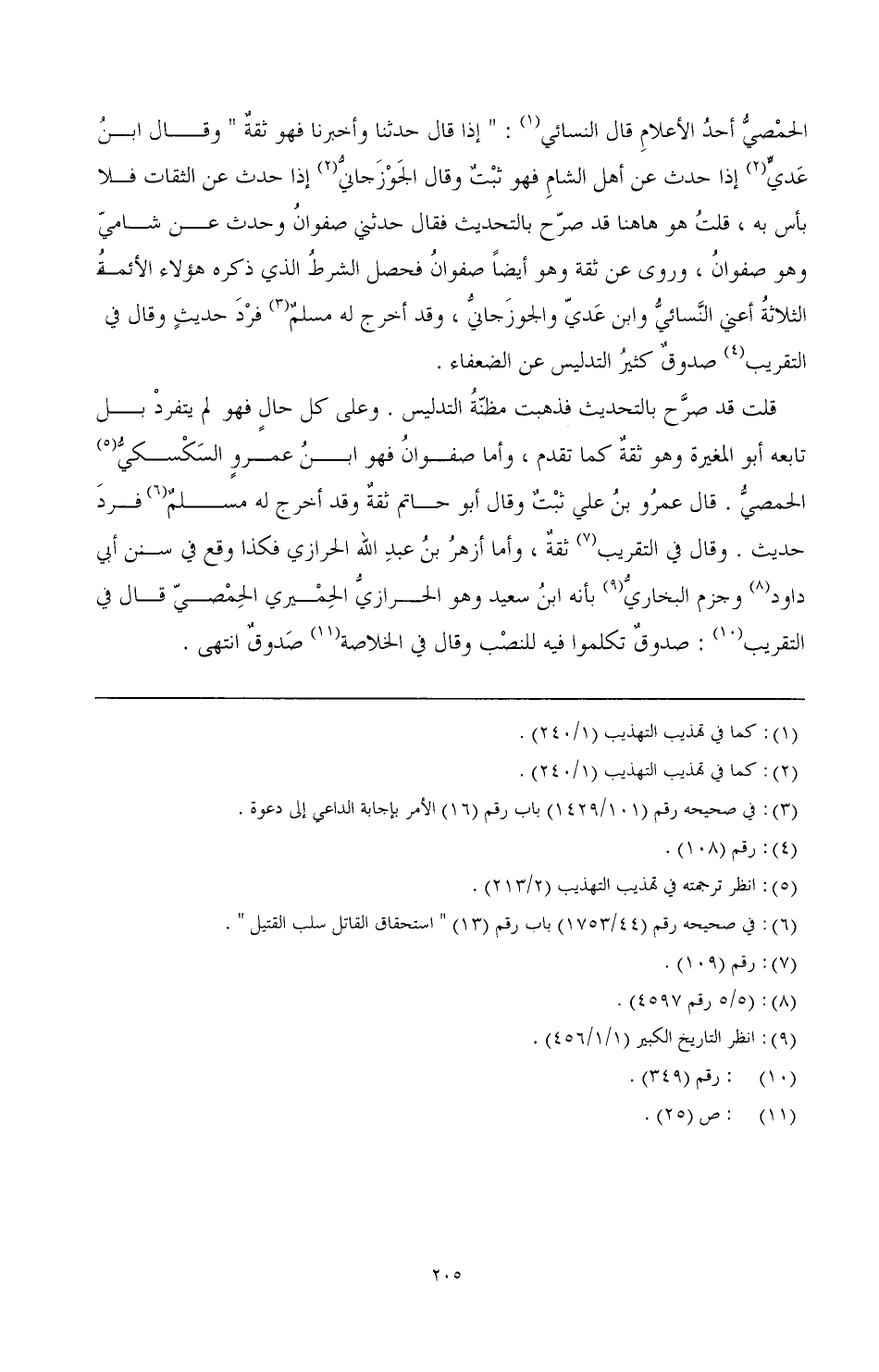 قلت قد صرح بالتحديث فذهبت مظنة التدليس. وعلى كل حال فهو لم يتفرد بل تابعه أبو المغيرة وهو ثقة كما تقدم، وأما صفوان فهو ابن عمرو السكسكي (¬6) الحمصي. قال عمرو بن علي: ثبت وقال أبو حاتم: ثقة وقد أخرج له مسلم (¬7) فرد حديث. وقال في التقريب (¬8): ثقة، وأما أزهر بن عبد الله الحرازي فكذا وقع في سنن أبي داود (¬9) وجزم البخاري (¬10) بأنه ابن سعيد وهو الحرازي الحميري الحمصي قال في التقريب (¬11) صدوق تكلموا فيه للنصب وقال في الخلاصة (¬12) صدوق انتهى.