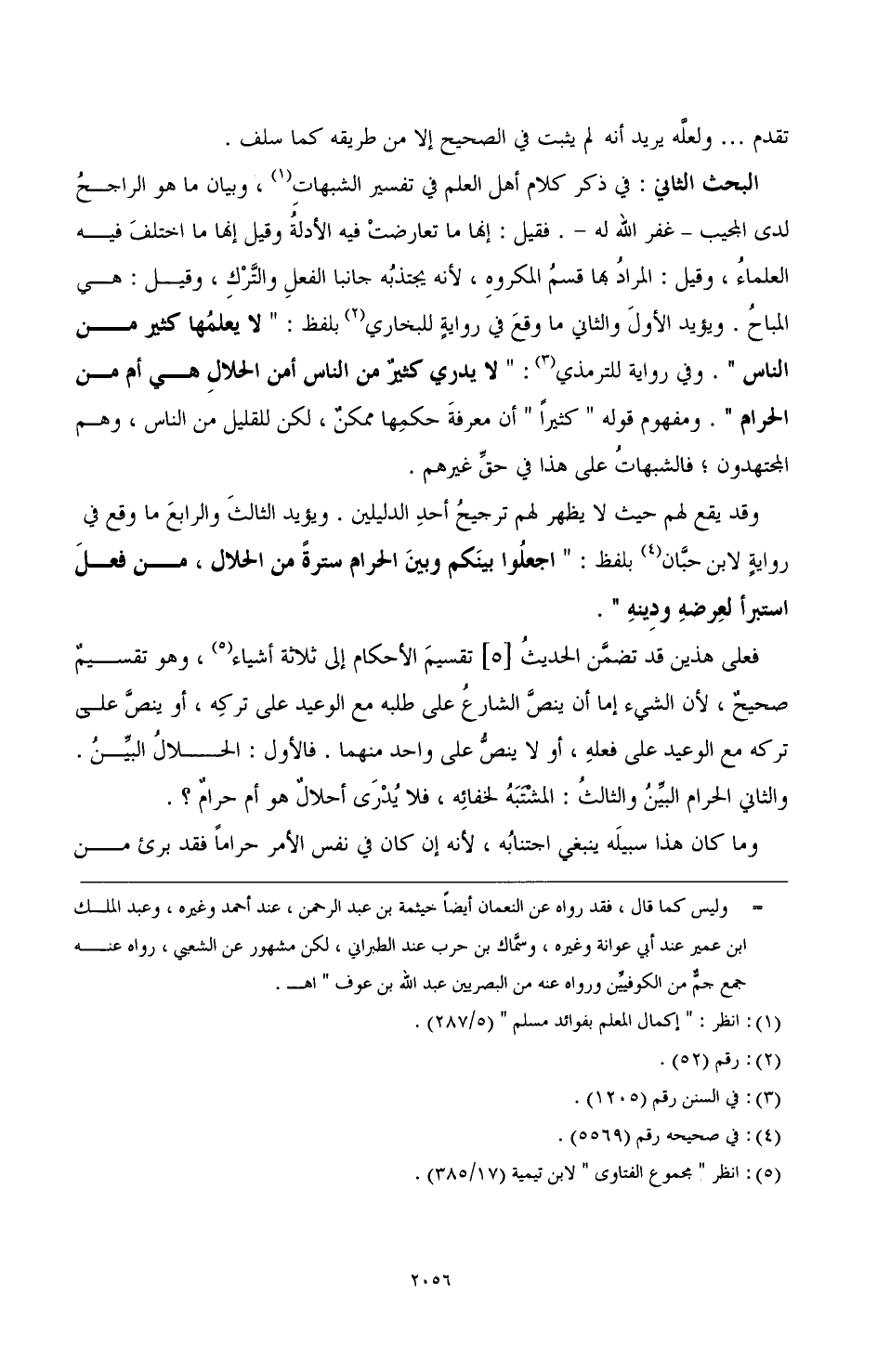 قال النووي في "شرح مسلم" (11/ 208): "وأما الشبهات فمعناه أنها ليست بواضحة الحل ولا الحرمة، فلهذا لا يعرفها كثير من الناس، ولا يعلمون حكمها، وأما العلماء فيعرفون حكمها بنص أو قياس أو استصحاب أو غير ذلك، فإذا تردد الشيء بين الحل والحرمة ولم يكن فيه نص ولا إجماع، اجتهد فيه المجتهد فألحقه بأحدهما بالدليل الشرعي، فإذا ألحقه به صار حلا، وقد يكون غير خال عن الاحتمال البين، فيكون الورع تركه، ويكون داخلا في قوله صَلَّى اللهُ عَلَيْهِ وَسَلَّمَ: "فمن اتقى الشبهات، فقد استبرأ لدينه وعرضه". وما لم يظهر للمجتهد فيه شيء وهو مشتبه، فهل يؤخذ بحله أم بحرمته أم يتوقف؟ فيه ثلاثة مذاهب حكاها القاضي عياض وغيره، والظاهر أنها مخرجة على الخلاف المذكور في الأشياء قبل ورود الشرع - وفيه أربعة مذاهب: