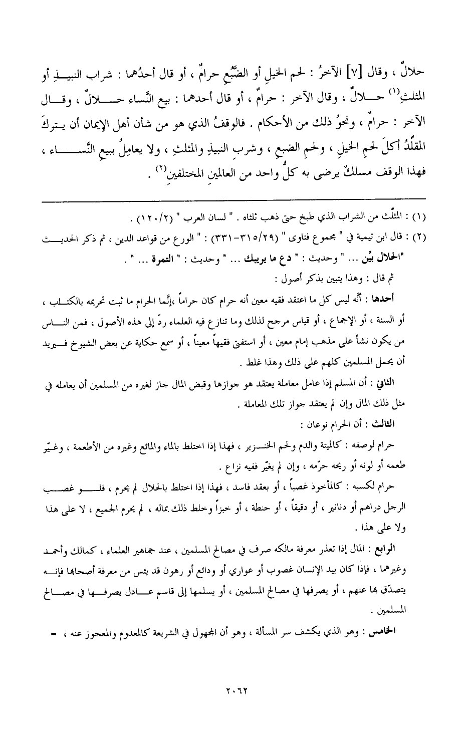 وكما أن الوقوف المحمود للمقلد هو ما ذكرناه؛ كذلك الوقوف للعالم المجتهد عند تعارض الأدلة هو أنه يترك ما فيه البأس إلى ما لا بأس به (¬1). مثلا إذا تعارضت عنده أدلة تحليل لحم الخيل والضبع والتحريم، وأدلة تحليل شرب النبيذ والمثلث وبيع النسا (¬2)، والتحريم، ولم يهتد إلى الترجيح، ولا إلى الجمع بين الأدلة، فالورع المحمود هو الوقف الذي أرشد إليه المصطفى - صَلَّى اللهُ عَلَيْهِ وَآلِهِ وَسَلَّمَ -، وهو أن لا يأكل لحم الخيل والضبع، ولا يشرب النبيذ والمثلث، ولا يعامل ببيع النساء، ولا يفتي بحل شيء من ذلك.