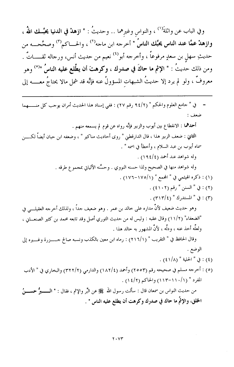 (¬2) وقال الحافظ ابن رجب الحنبلي في "جامع العلوم والحكم" (ص 6): "وعن أبي داود قال: نظرت في الحديث المسند، فإذا هو أربعة آلاف حديث، ثم نظرت فإذا مدار الأربعة آلاف حديث على أربعة أحاديث: حديث النعمان بن بشير "الحلال بين والحرام بين" وحديث عمر "إنما الأعمال بالنيات" وحديث أبي هريرة: "إن الله طيب لا يقبل إلا طيبا، وإن الله أمر المؤمنين بما أمر به المرسلين" وحديث: "من حسن إسلام المرء تركه ما لا يعنيه" قال: فكل حديث من هذه الأربعة ربع العلم".