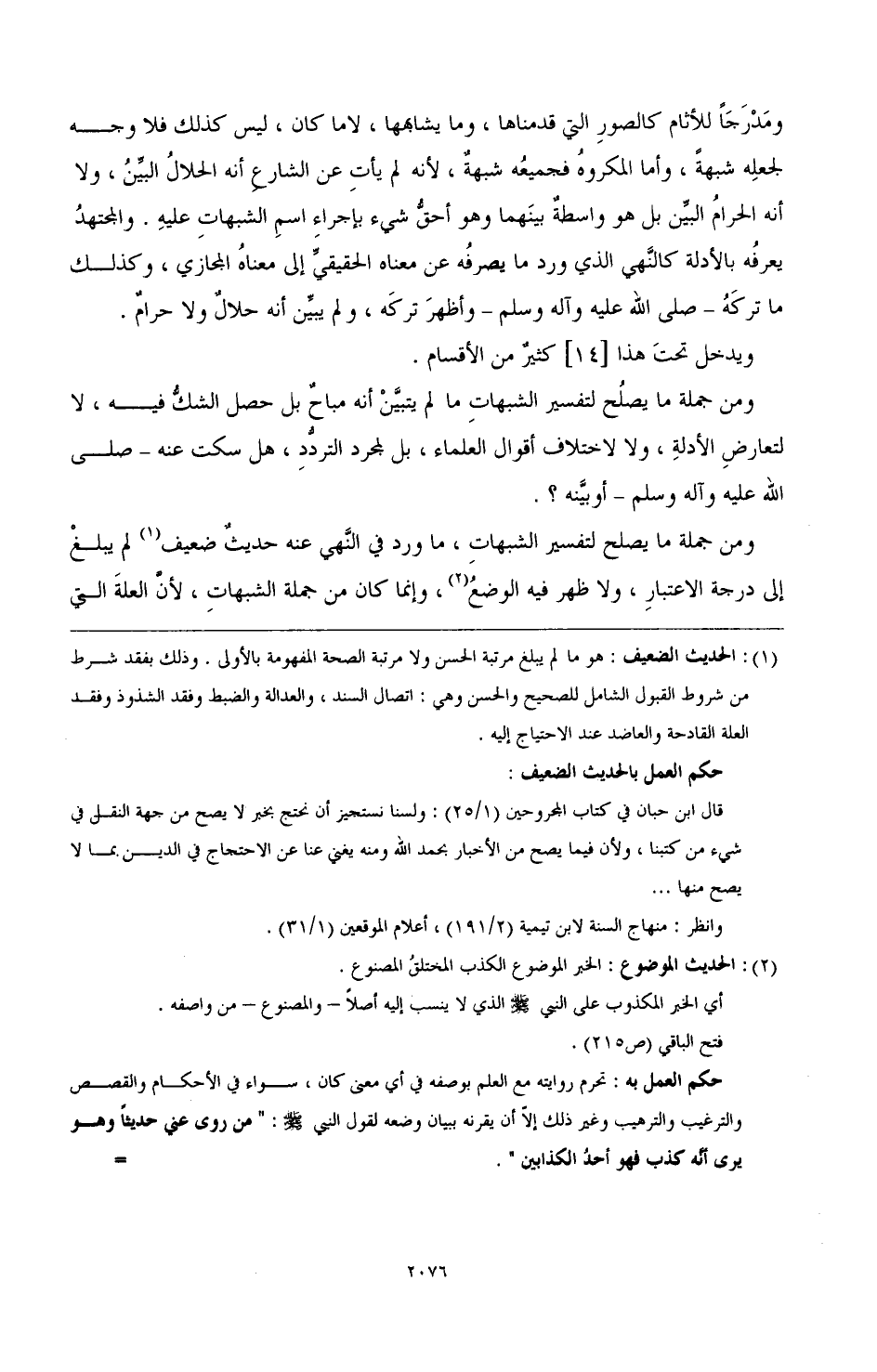 (¬1) بل قد ذكر الشوكاني في "وبل الغمام على شفاء الأوام" (1/ 53 - 56): وقد سوغ بعض أهل العلم العمل بالضعيف في ذلك مطلقا، وبعضهم منع من العمل بما لم تقم به الحجة مطلقا وهو الحق، لأن الأحكام الشرعية متساوية الأقدام، فلا يحل أن ينسب إلى الشرع ما لم يثبت كونه شرعا، لأن ذلك من التقول على الله بما لم يقل، وما كان في فضائل الأعمال إذا جعل ذلك العمل منسوبا إليه نسبة المدلول إلى الدليل، فلا ريب أن العمل به وإن كان لم يفعل إلا الخير من صلاة أو صيام أو ذكر، لكنه مبتدع في ذلك الفعل، من حديث يجوز اعتقاد مشروعية ما ليس بشرع، وأجر ذلك العمل لا يوازي وزر الابتداع، فلم يكن فعل، ما لم تثبت له مصلحة خالصة، بل معارضة بمفسدة، هي إثم البدعة ودفع المفاسد أهم من جلب المصالح، ثم مثل هذا مما يندرج تحت عموم حديث "كل بدعة ضلالة".
