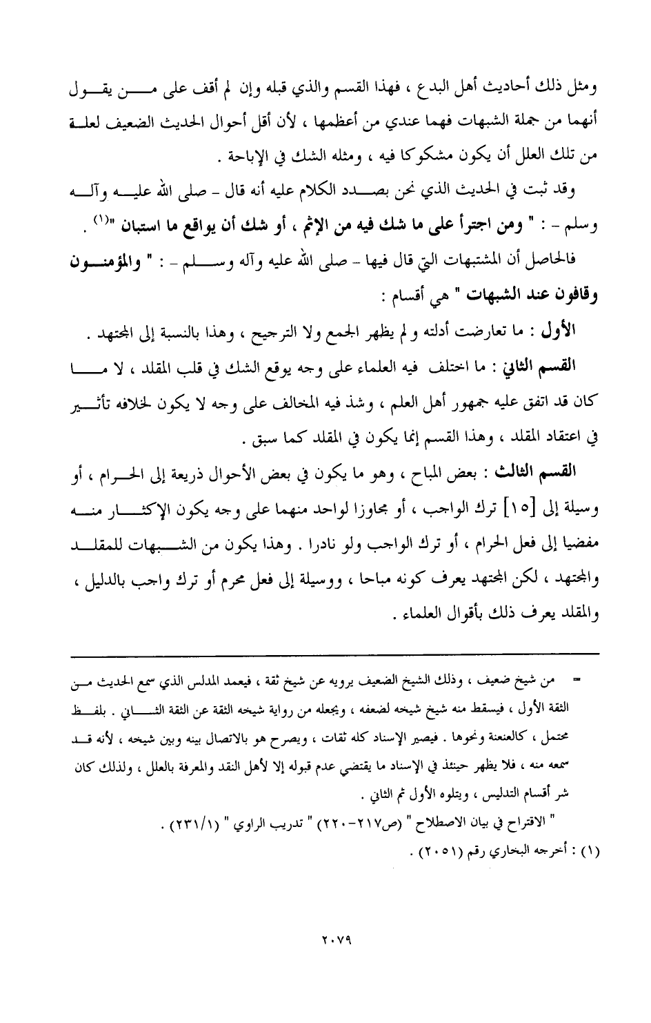 وهذان القسمان كما يكونان شبهة للمجتهد يكونان أيضًا شبهة للمقلد بتنزيل شك إمامه بمنزلة شكه، وبتنزيل الرواية الضعيفة عن إمامه بمنزلة الرواية الضعيفة في الحديث بالنسبة إلى المجتهد. وقد تقدم الوجه لكل واحد من هذه الصور التي فسرنا بها المشتبهات.