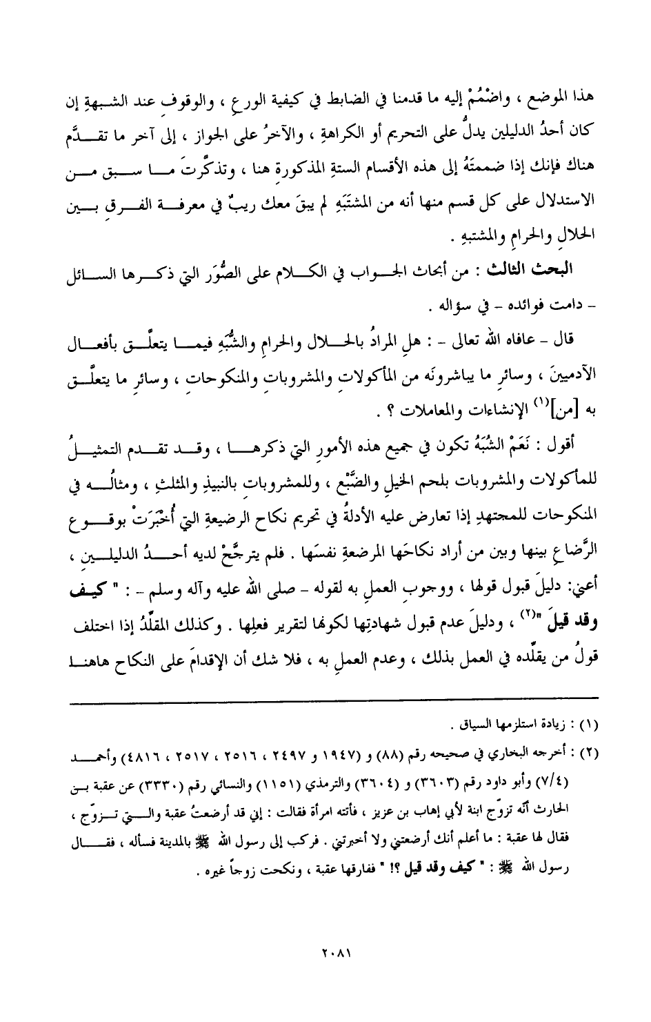 قال - عافاه الله -: وما المراد بالاتقاء للشبهة في ذلك؟ وما تمثيله؟ فهل المراد مثلا ما وقع لبعض العلماء أنه وقع نهب أموال في جهة من جهات الإسلام، بالقرب من بلده، فترك جميع المأكولات من اللحم والحب وسائر ما جلب إلى محله، واقتصر على أكل العشب سنة، وقد مقت عليه كثير من علماء عصره؟ ذكره ابن القيم، أو معناه في الكلم الطيب (¬1) .. انتهى.