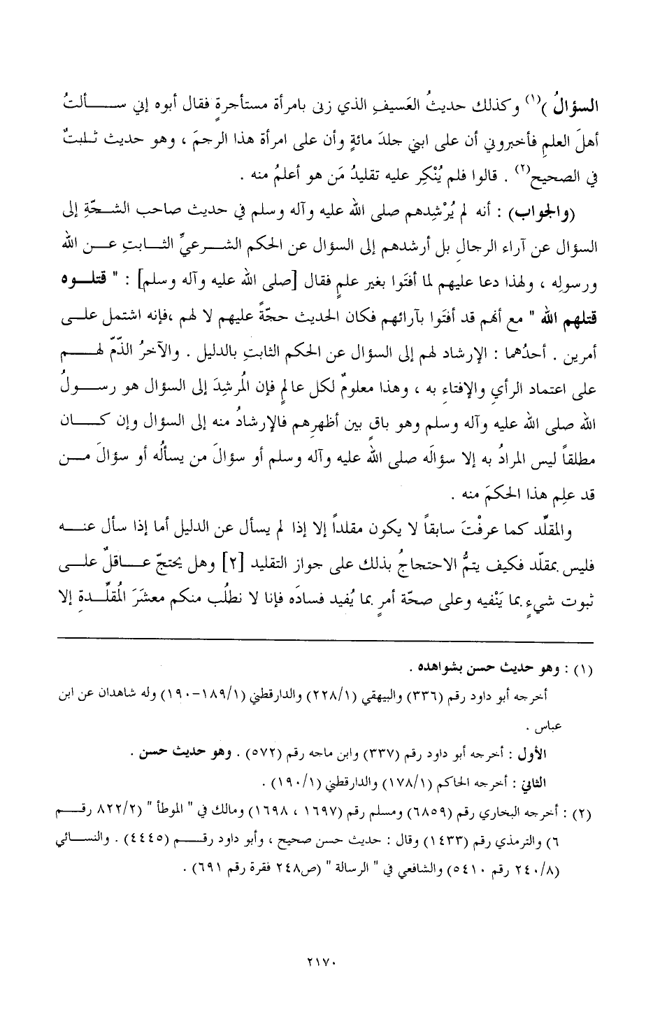 (الجواب): أنه لم يرشدهم- صَلَّى اللهُ عَلَيْهِ وَآلِهِ وَسَلَّمَ- في حديث صاحب الشحة إلى السؤال عن آراء الرجال بل أرشدهم إلى السؤال عن الحكم الشرعي الثابت عن الله ورسوله، ولهذا دعا عليهم لما أفتوا بغير علم فقال [- صَلَّى اللهُ عَلَيْهِ وَآلِهِ وَسَلَّمَ-]: «قتلوه قتلهم الله» مع أنهم قد أفتوا بآرائهم فكان الحديث حجة عليهم لا لهم، فإنه اشتمل على أمرين. أحدهما: الإرشاد لهم إلى السؤال عن الحكم الثابت بالدليل. والآخر الذم لهم على اعتماد الرأي والإفتاء به، وهذا معلوم لكل عالم فإن المرشد إلى السؤال هو رسول الله- صَلَّى اللهُ عَلَيْهِ وَآلِهِ وَسَلَّمَ- وهو باق بين أظهرهم فالإرشاد منه إلى السؤال وأن كان مطلقا ليس المراد به إلا سؤاله- صَلَّى اللهُ عَلَيْهِ وَآلِهِ وَسَلَّمَ- أو سؤال من يسأله أو سؤال من قد علم هذا الحكم منه.