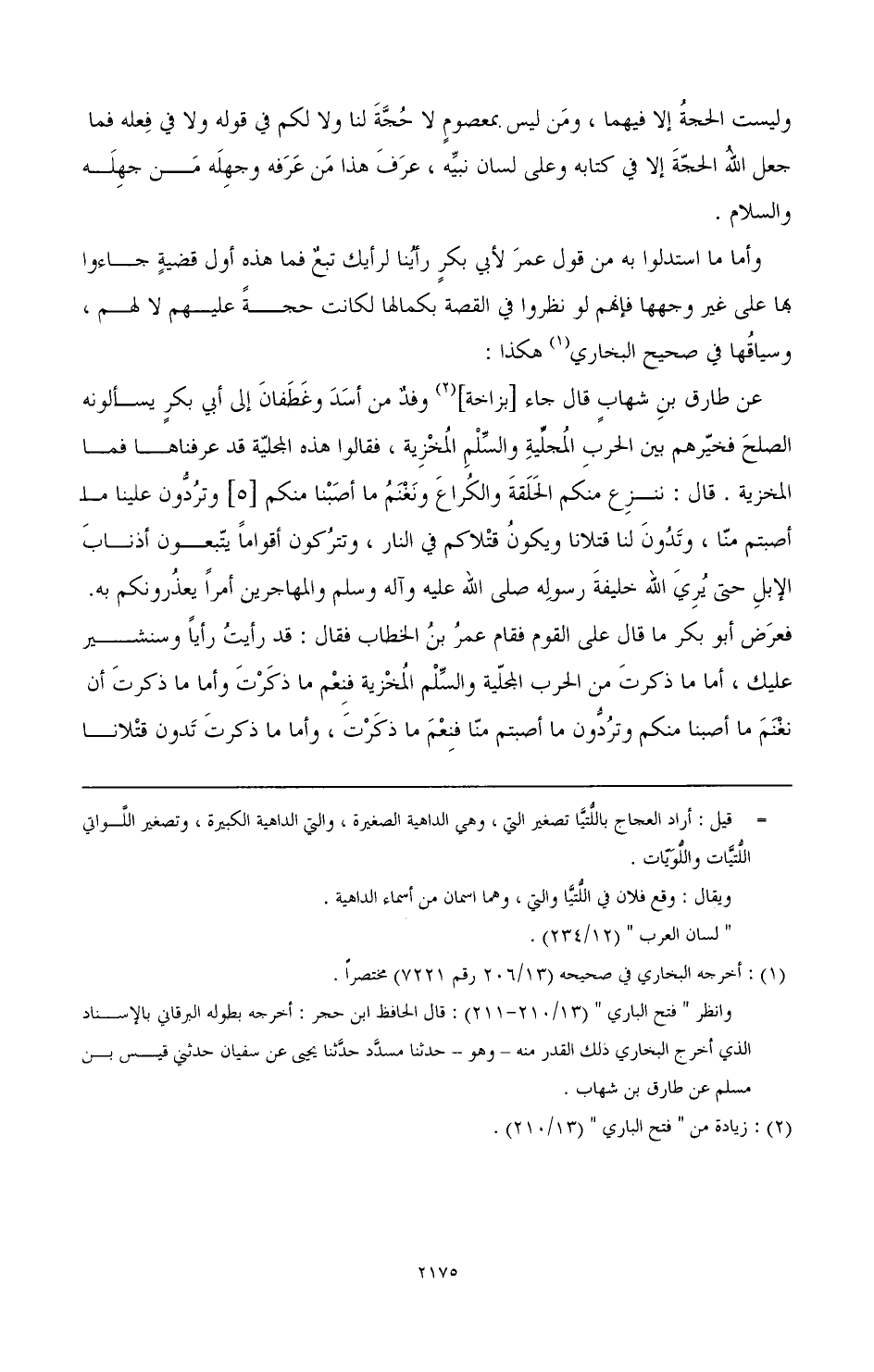 وأما ما استدلوا به من قول عمر لأبي بكر رآينا لرأيك تبع فما هذه أول قضية جاءوا بها على غير وجهها فإنها لو نظروا في القصة بكمالها لكانت حجة عليهم لا لهم، وسياقها في صحيح البخاري (¬1) هكذا: