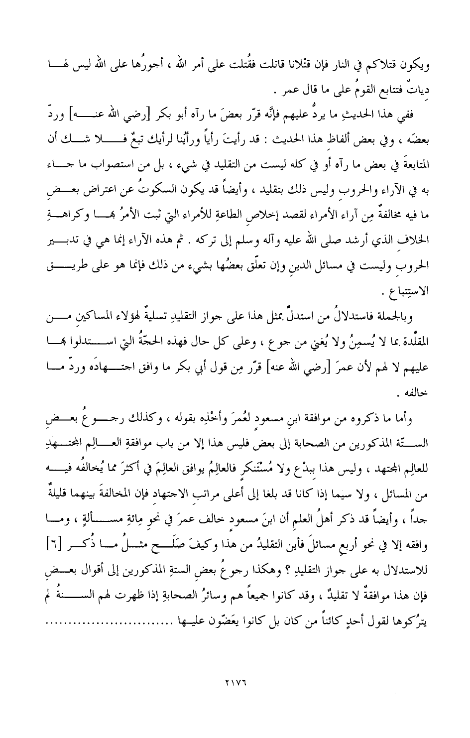 وأما ما ذكروه من موافقة ابن مسعود لعمر وأخذه بقوله، وذلك رجوع بعض الستة المذكورين من الصحابة إلى بعض فليس هذا إلا من باب موافقة العالم المجتهد للعالم المجتهد، وليس هذا ببدع ولا مستنكر فالعالم يوافق العالم في أكثر مما يخالفه فيه من المسائل، ولا سيما إذا كانا قد بلغا إلى أعلى مراتب الاجتهاد فإن المخالفة قليلة جدا، وأيضا قد ذكر أهل العلم أن ابن مسعود خالف عمر في نحو مائة مسألة، وما وافقه إلا في نحو أربع مسائل فأين التقليد من هذا ويكف صلح مثل ما ذكر [6] للاستدلال به على جواز التقليد؟ وهكذا رجوع الستة المذكورين إلى أقوال بعض فإن هذا موافقة لا تقليد، وقد كانوا جميعا هم وسائر الصحابة إذا ظهرت لهم السنة لم يتركوها لقول أحد كائنا من كان بل كانوا يعضون عليها ...........