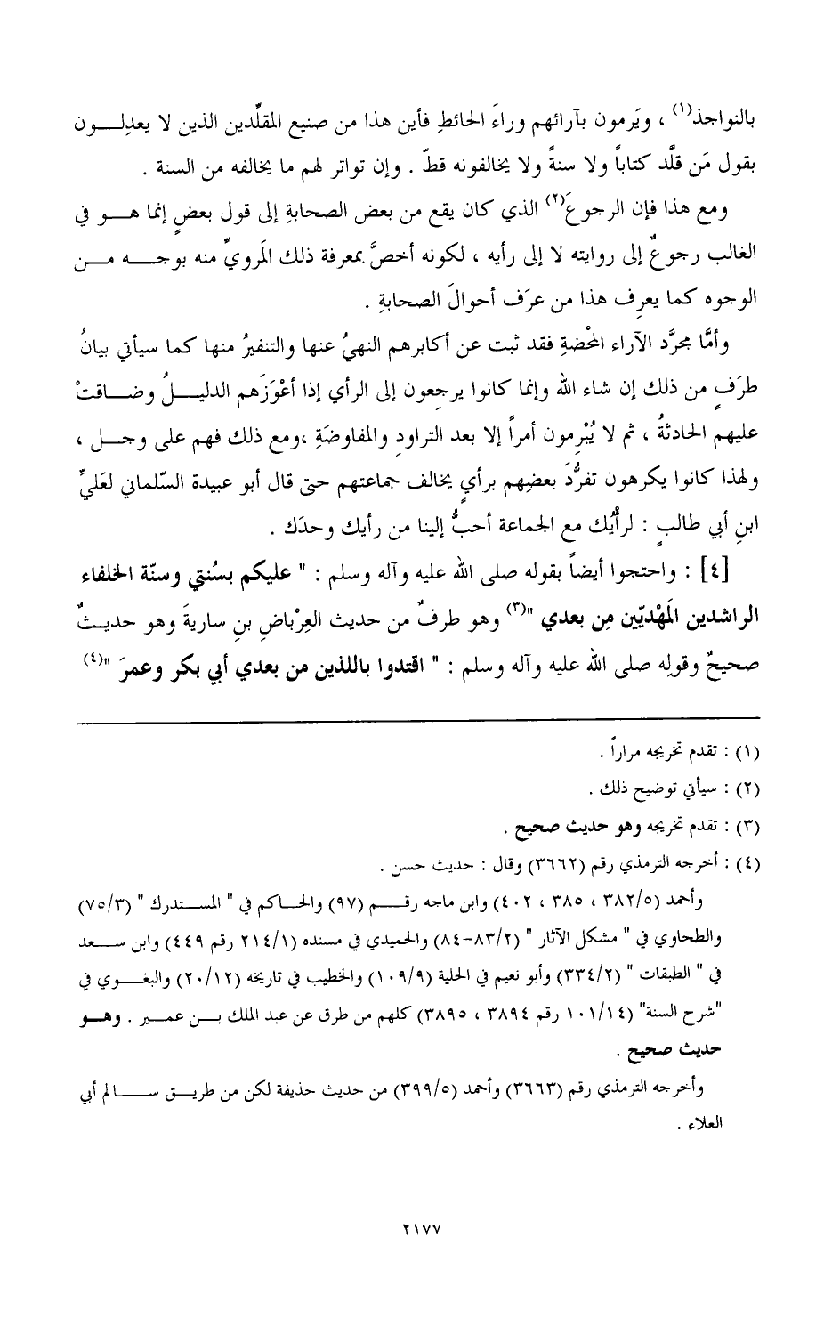[4]: واحتجوا أيضًا بقوله- صَلَّى اللهُ عَلَيْهِ وَآلِهِ وَسَلَّمَ-: «عليكم بسنتي وسنة الخلفاء الراشدين المهديين من بعدي «(¬3) وهو طرف من حديث العرباض بن سارية وهو حديث صحيح وقوله- صَلَّى اللهُ عَلَيْهِ وَآلِهِ وَسَلَّمَ-:"اقتدوا باللذين من بعدي أبي بكر وعمر» (¬4)