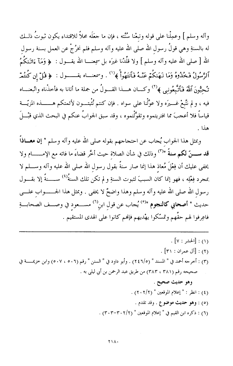 وبمثل هذا الجواب يجاب عن اتجاجهم بقوله- صَلَّى اللهُ عَلَيْهِ وَآلِهِ وَسَلَّمَ- «إن معاذا قد سن لكم سنة» (¬2) وذلك فى شأن الصلاة حيث أخر قضاء ما فانه مع اٌمام ولا يخفى عليك أن فعل معاذ هذا إنما صار سنة بقول رسول الله- صَلَّى اللهُ عَلَيْهِ وَآلِهِ وَسَلَّمَ- لا بمجرد فعله، فهو إنما كان السبب لثبوت السنة ولم تكن تلك السنة (¬3) سنة إلا بقول رسول الله- صَلَّى اللهُ عَلَيْهِ وَآلِهِ وَسَلَّمَ- وهذا واضح لايخفى. وبمثل هذا الجواب على حديث «أصحابي كالنجوم» (¬4) يجاب عن قول ابن (¬5) مسعود في وصف الصحابة فاعرفوا لهم حقهم وتمسكوا يهديهم فإنهم كانوا علي الهدى المستقيم.