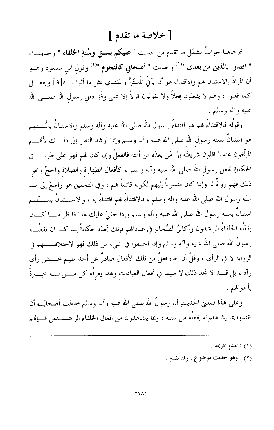 وقوله فالاقتداء بهم هواقتداء برسول الله- صَلَّى اللهُ عَلَيْهِ وَآلِهِ وَسَلَّمَ- والاستنان بسنتهم هو استنان بسنة رسول الله- صَلَّى اللهُ عَلَيْهِ وَآلِهِ وَسَلَّمَ- وإنما أرشد الناس إلى ذلك لأنهم المبلغون عنه الناقلون شريعته إلى من بعده من أمته فالفعل وإن كان لهم فهو على طريق الحكاية لفعل رسول الله عليه وآله وسلم، كأفعال الطهارة والصلاة والحج ونحو ذلك فهم رواة له وإنما كان منسوبا اليهم لكونه قائما بهم: وفي التحقيق هو راجع إلى ما سنه رسول بسنة رسول الله- صَلَّى اللهُ عَلَيْهِ وَآلِهِ وَسَلَّمَ-، فالاقتداء بهم اقتداء به، والاستنان بسنتهم استنان بسنة رسول الله- صَلَّى اللهُ عَلَيْهِ وَآلِهِ وَسَلَّمَ- وإذا خفي عليك هذا فانظر ما كان يفعله الخلفاء الراشدون وأكابر الصحابة في عباداتهم فإنك تجده حكاية لما كان يفعله رسول الله- صَلَّى اللهُ عَلَيْهِ وَآلِهِ وَسَلَّمَ- وإذغ اختلفوا في شئ من ذلك فهو لاختلافهم في الرواية لا في الرأي، وقل أن جاء فعل من تلك الأفعال صادر عن أحد منهم لمحض رأي رآه، بل قد تجد ذلك لا سيما في أفعال العبادات وهذا يعرفه كل من له خبرة بأحوالهم.