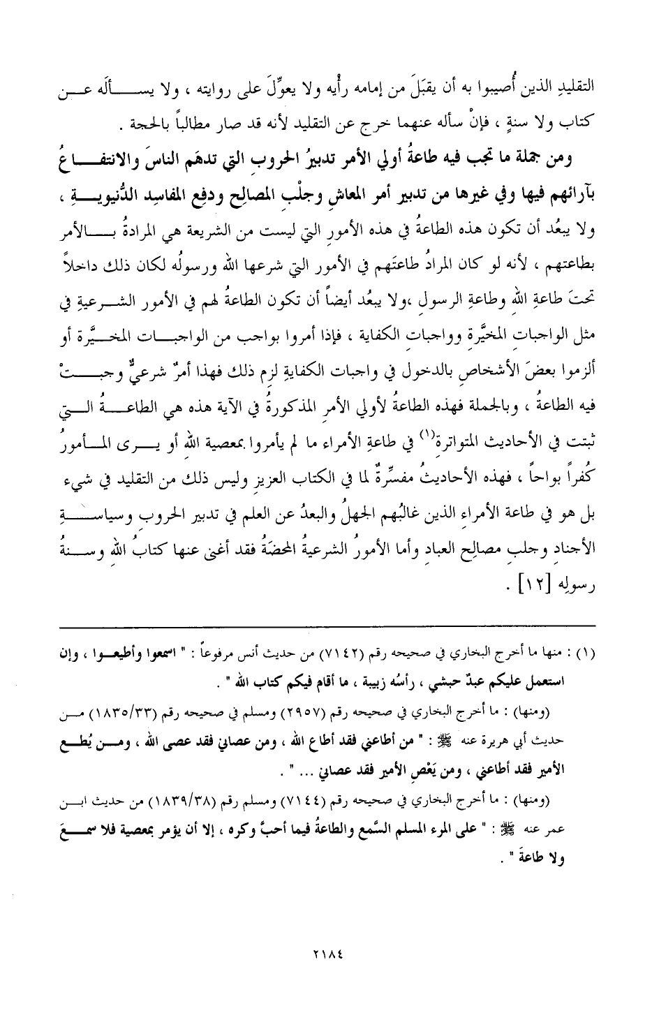 ومن حملة ما تجب فيه طاعة أولي الأمر تدبير الحروب التي تدهم الناس والانتفاع بآرائهم فيها وقي غيرها من تدبير أمر المعاش وجلب المصالح ودفع المفاسد الدنيوية، ولا يبعد أن تكون هذه الطاعة في هذه الأمور التي ليست من الشريعة هي المرادة بالأمر بطاعتهم، لأنه لو كان المراد طاعتهم في الأمور التي شرعها الله ورسوله لكان ذلك داخلا تحت طاعة الله وطاعة الرسول، ولا يبعد أيضًا أن تكون الطاعة لهم في الأمور الشرعية في مثل الواجبات المخيرة وواجبات الكفاية، فإذا أمروا بواجب من الواجبات المخيرة أو ألزموا بعض الأشخاص بالدخول في واجبات الكفاية لزم ذلك فهذا أمر شرعي وجبت فيه الطاعة، وبالجملة فهذه الطاعة لأولي الأمر المذكورة في الآية هذه هيالطاعة التي ثبتت في الأحاديث المتواترة (¬1) في طاعة الأمراء ما لم يأمروا بمعصية الله أو يرى المأمور كفرا بواحا، فهذه الأحاديث مفسرة لما في الكتاب العزيز وليس ذلك من التقليد في شيء بل هو في طاعة الأمراء الذين غالبهم الجهل والبعد في تدبير الحروب وسياسة الأجناد وجلب مصالح العباد وأما الأمور الشرعية المحضة فقد أغنى عنها كتاب الله وسنة رسوله [12]