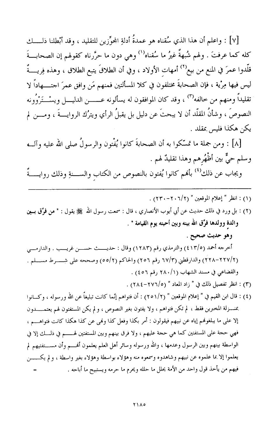 [8]: ومن جملة ما تمسكوا به أن الصحابة كانوا يفتون ورسول الله- صَلَّى اللهُ عَلَيْهِ وَآلِهِ وَسَلَّمَ- حتى بين أظهرهم وهذا تقليد لهم.